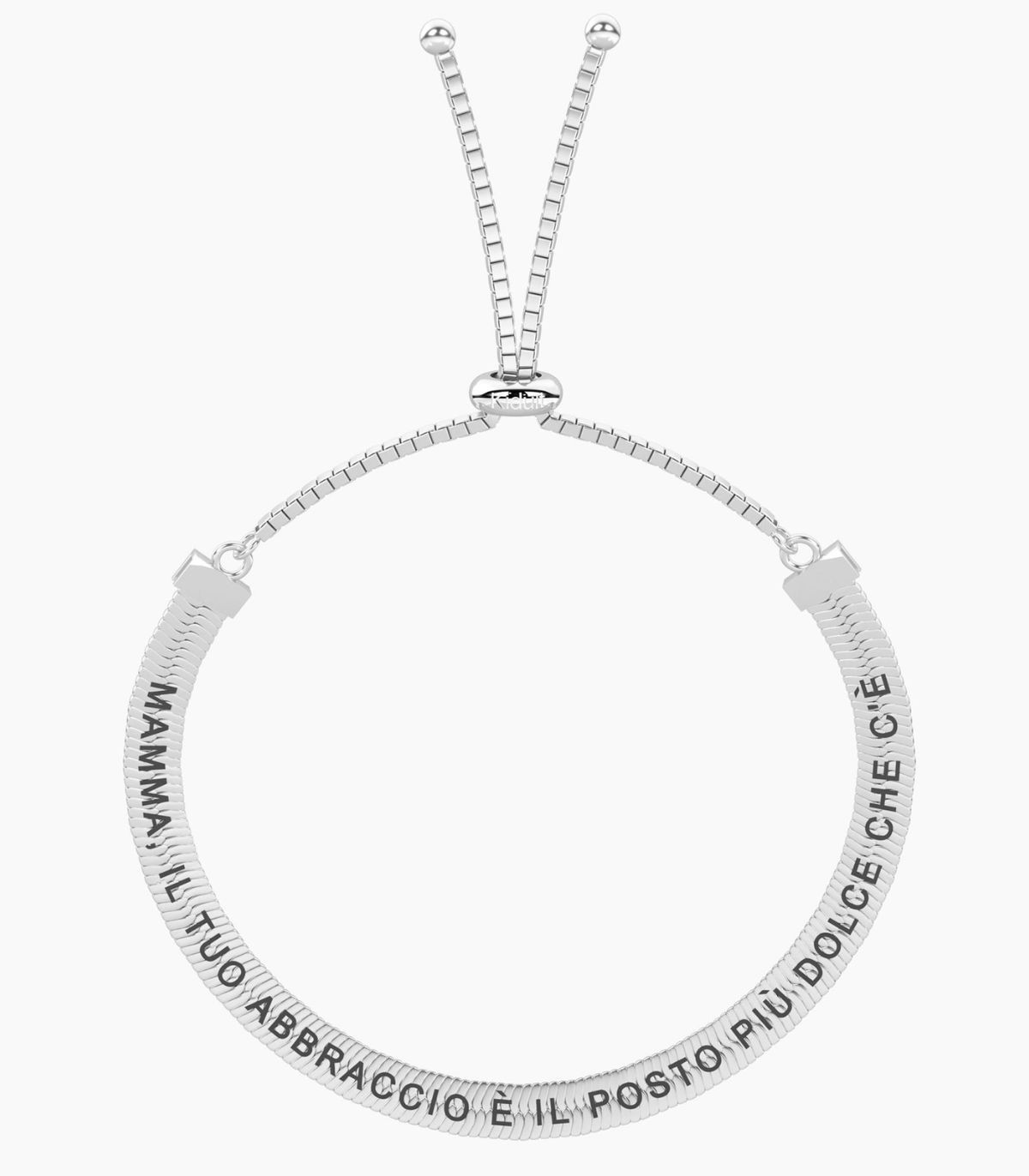 Bracciale Kidult da donna regolabile con catena veneta in herringbone e acciaio lucido e satinato. Scritta "Mamma, il tuo abbraccio è il posto più dolce che c'è".