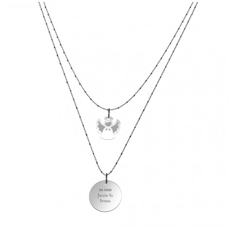 Al primo filo (lunghezza cm. 40) è appeso un ciondolo a forma dell’icona corrispondente al proposito, al secondo (lunghezza cm. 45) è appesa una medaglia di 15mm con inciso il Buon proposito e sul retro il marchio ANNA BIBLO. Tutte le parti metalliche sono di acciaio anallergico.
