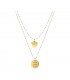 Al primo filo (lunghezza cm. 40) è appeso un ciondolo a forma dell’icona corrispondente al proposito, al secondo (lunghezza cm. 45) è appesa una medaglia di 15mm con inciso il Buon proposito e sul retro il marchio ANNA BIBLO. Tutte le parti metalliche sono di acciaio anallergico.