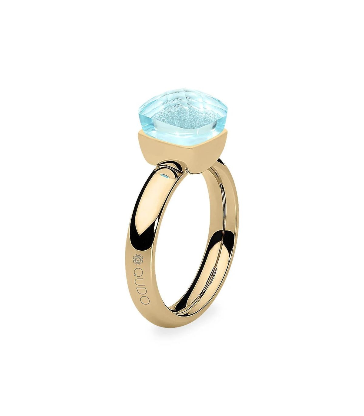 Anello realizzato in acciaio dorato, caratterizzato da un cristallo solitario centrale sfaccettato, color acquamarina.