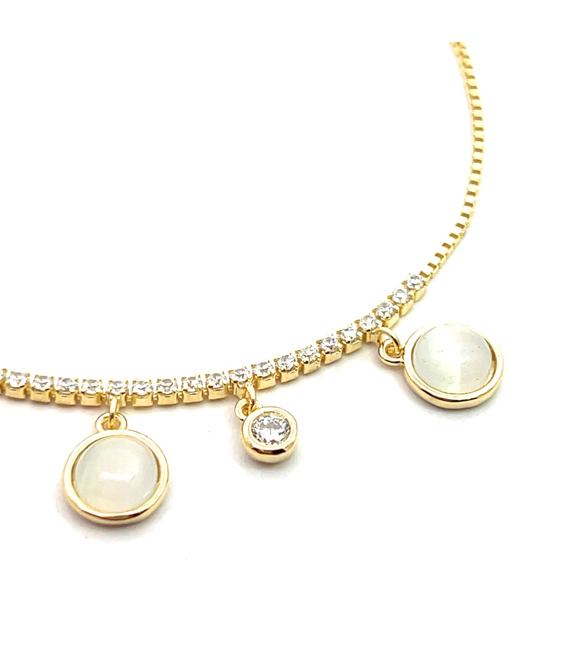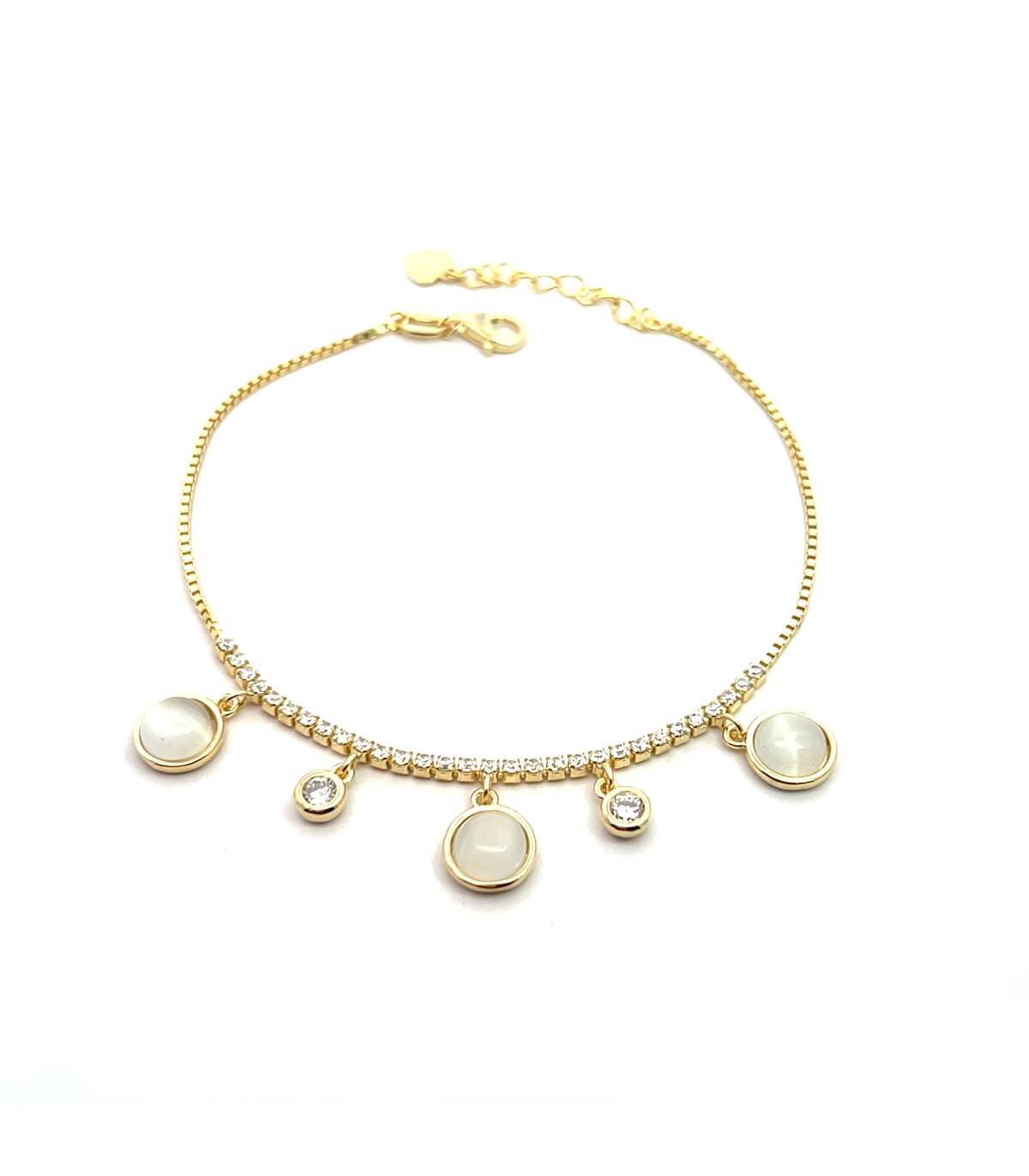 Bracciale in argento dorato con pendenti di zirconi bianchi e pietre tonde. Chiusura a moschettone.