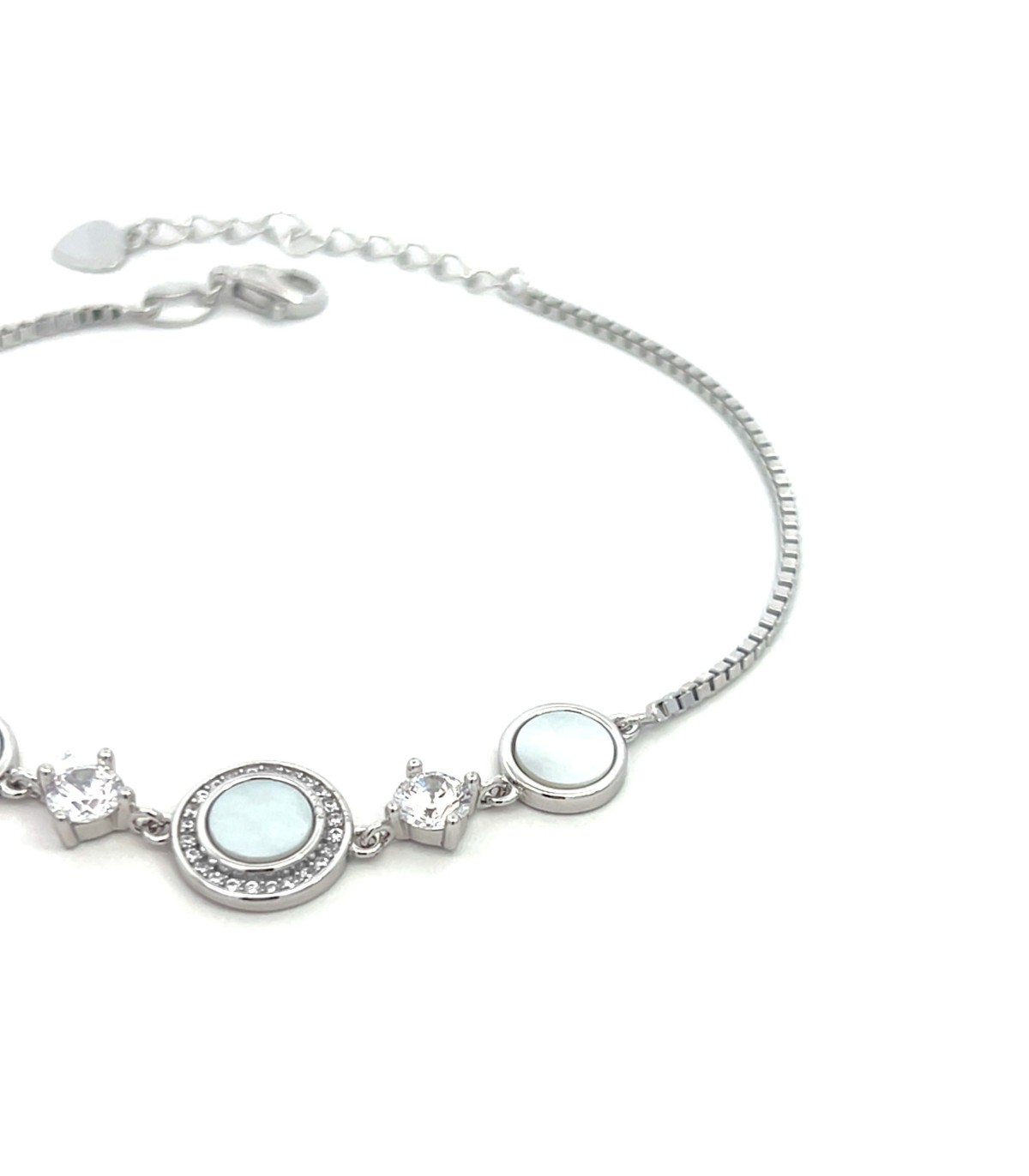 Bracciale in argento con zirconi bianchi e pietre tonde passanti. Chiusura a moschettone.