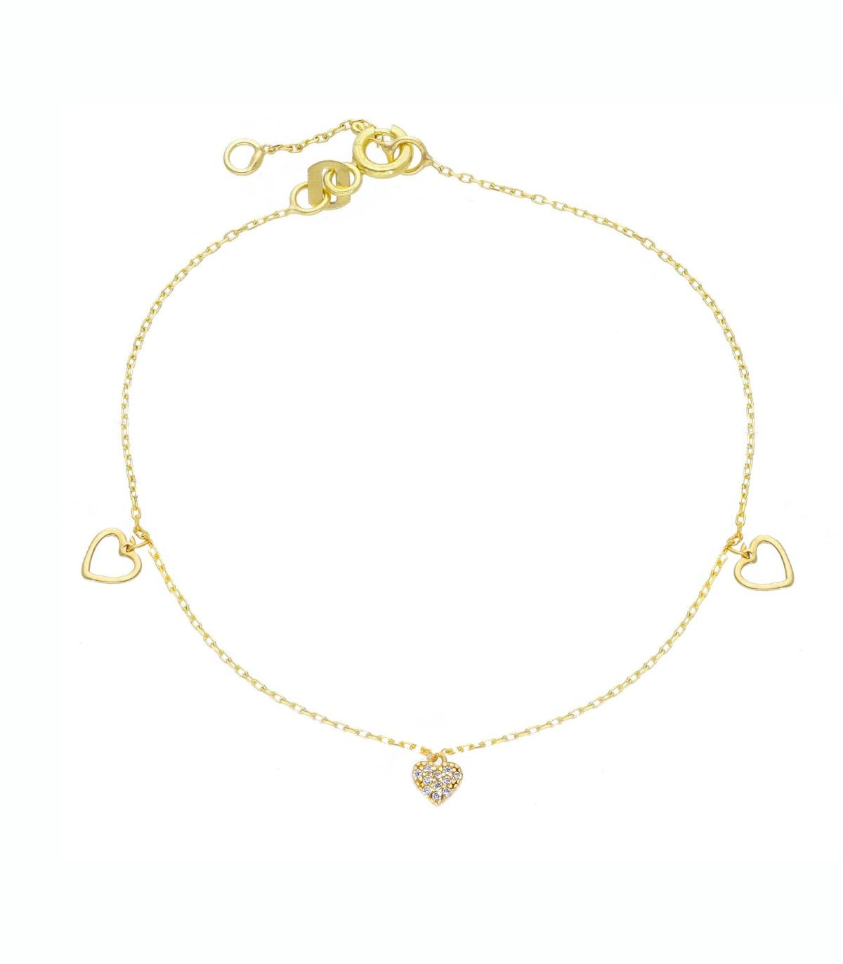 Bracciale con due cuori filo e un cuore impreziosito da zirconi bianchi, realizzato in oro giallo 9kt.