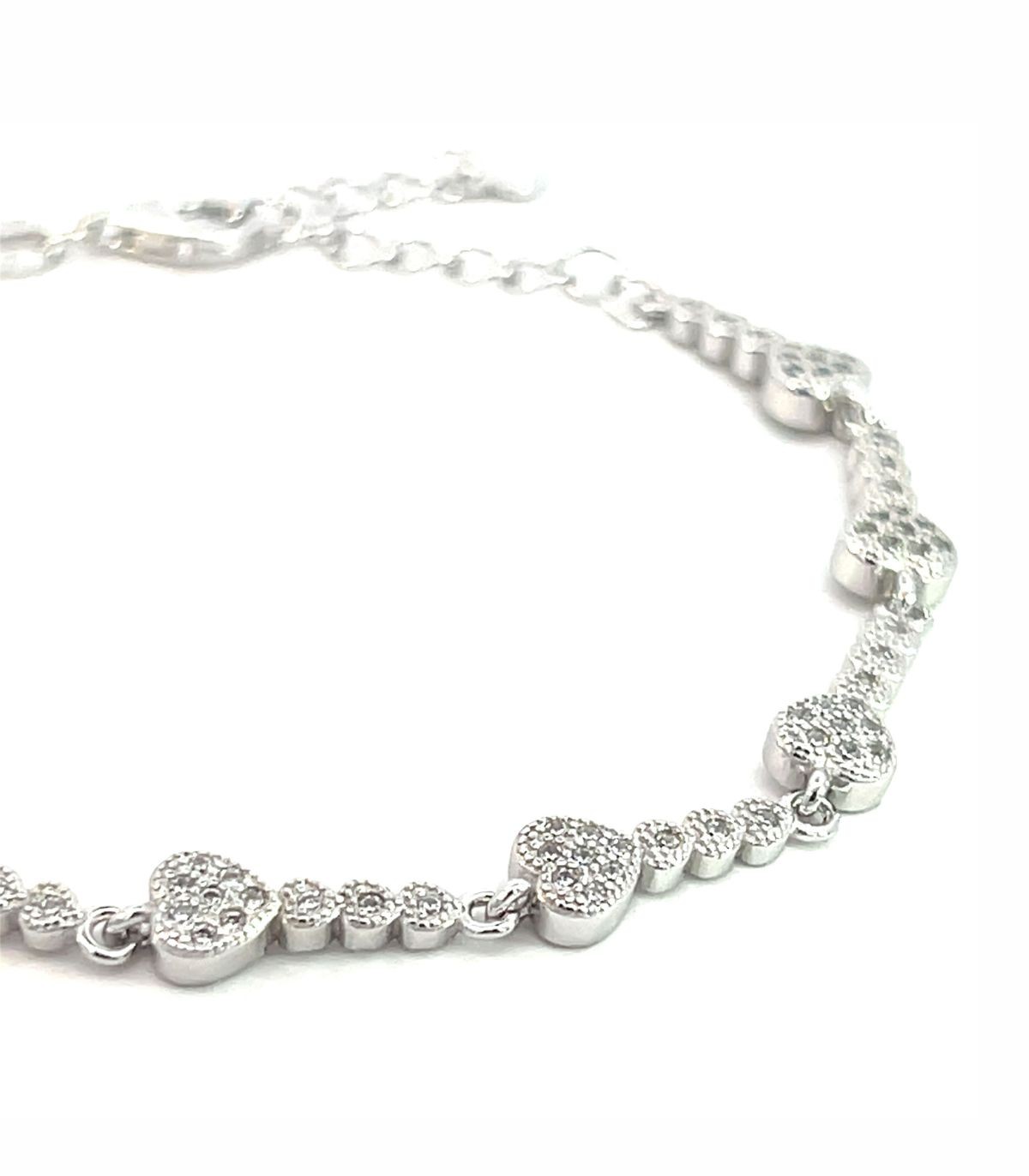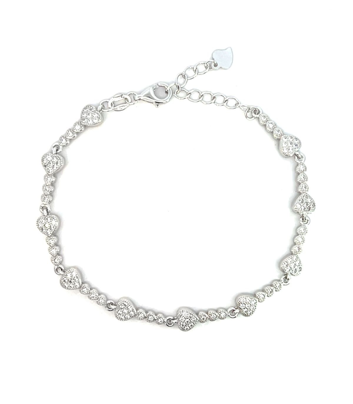 Bracciale in argento, con dieci cuori passanti, impreziositi da zirconi bianchi.