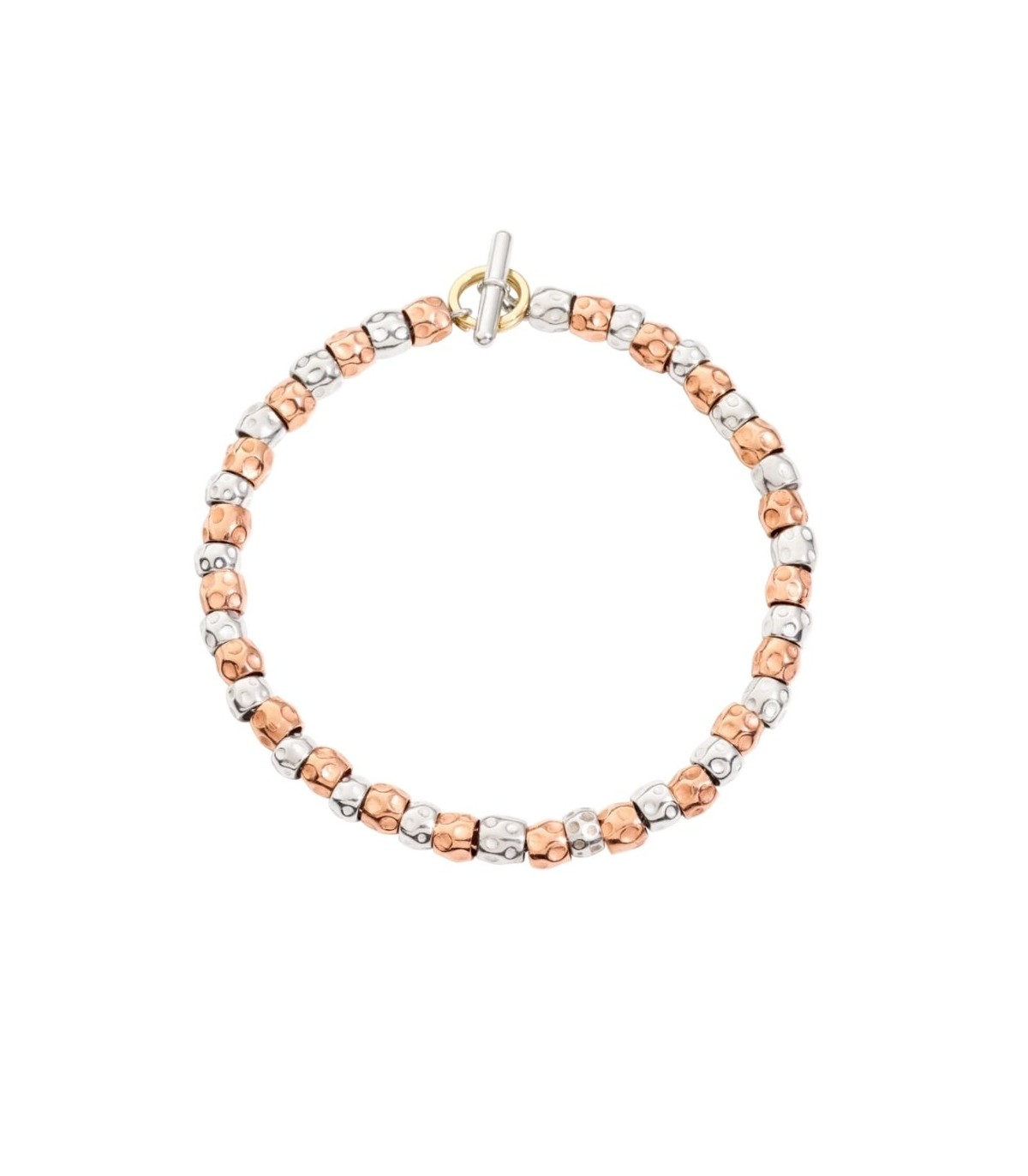 Bracciale Granelli in argento 925 e oro rosa 9kt, catena e t-bar in argento, anello brisè in oro giallo 18K. Ago in argento 925 incluso.