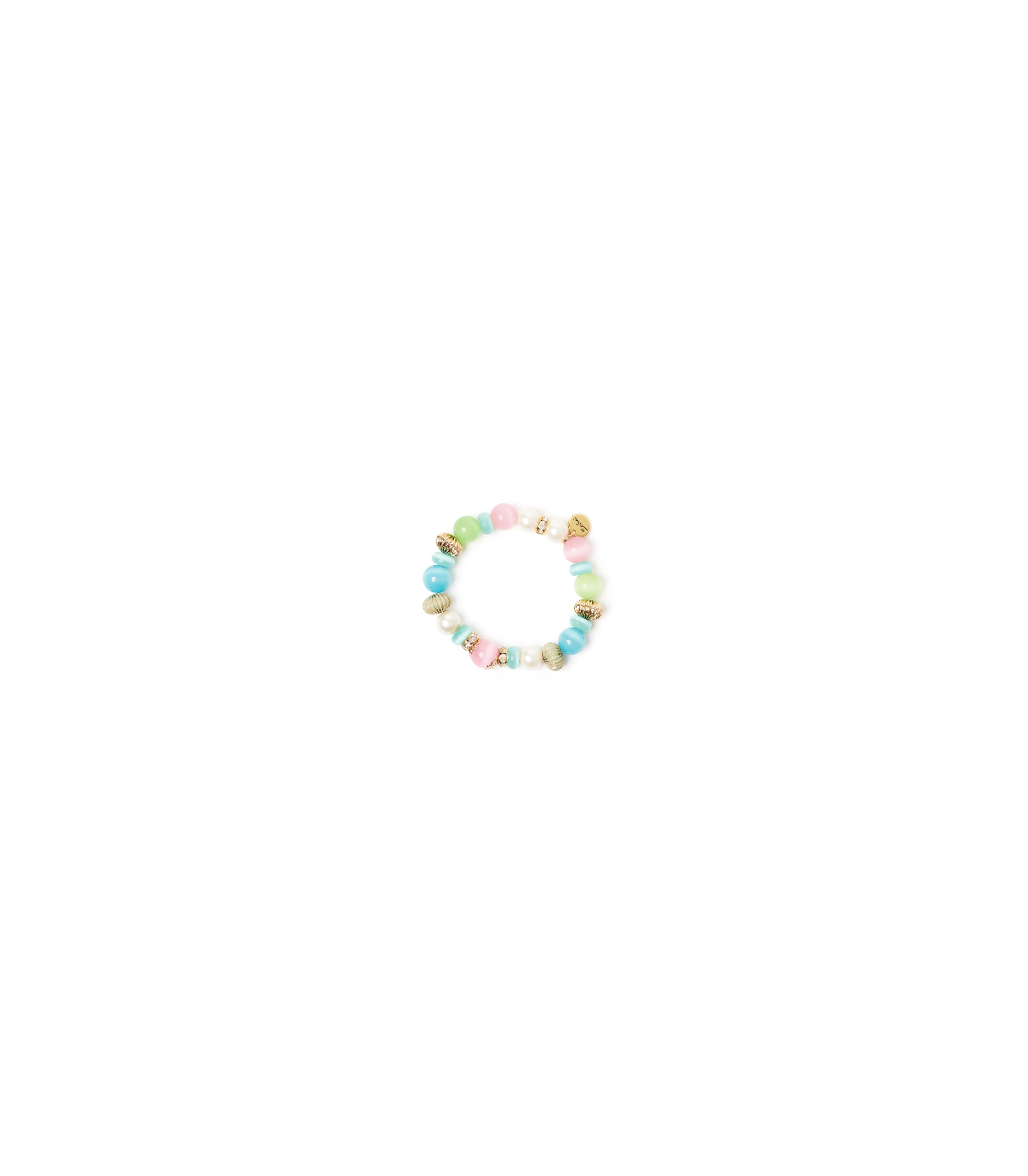 Bracciale con filo di perle, bonbon, sfere e anellini di strass, con cromie multicolore e oro. Targhetta Sodini pendente. targhetta Sodini come pendente