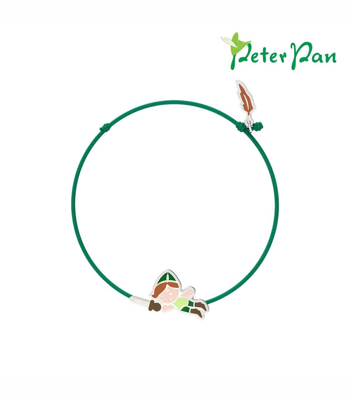 Bracciale con ciondolo ispirato al personaggio di Peter Pan, realizzato in Argento e smalto, con cordino verde.