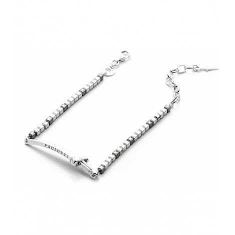 Bracciale da uomo 4US di Cesare Paciotti della collezione Cubism. Questo bracciale è uno dei best seller di Cesare Paciotti grazie all'iconico simbolo del pugnale come elemento centrale e cubi alternati sul polso. Bracciale realizzato in argento 925 e pietre ematite. Lunghezza regolabile grazie all'estensione e alla chiusura a moschettone.