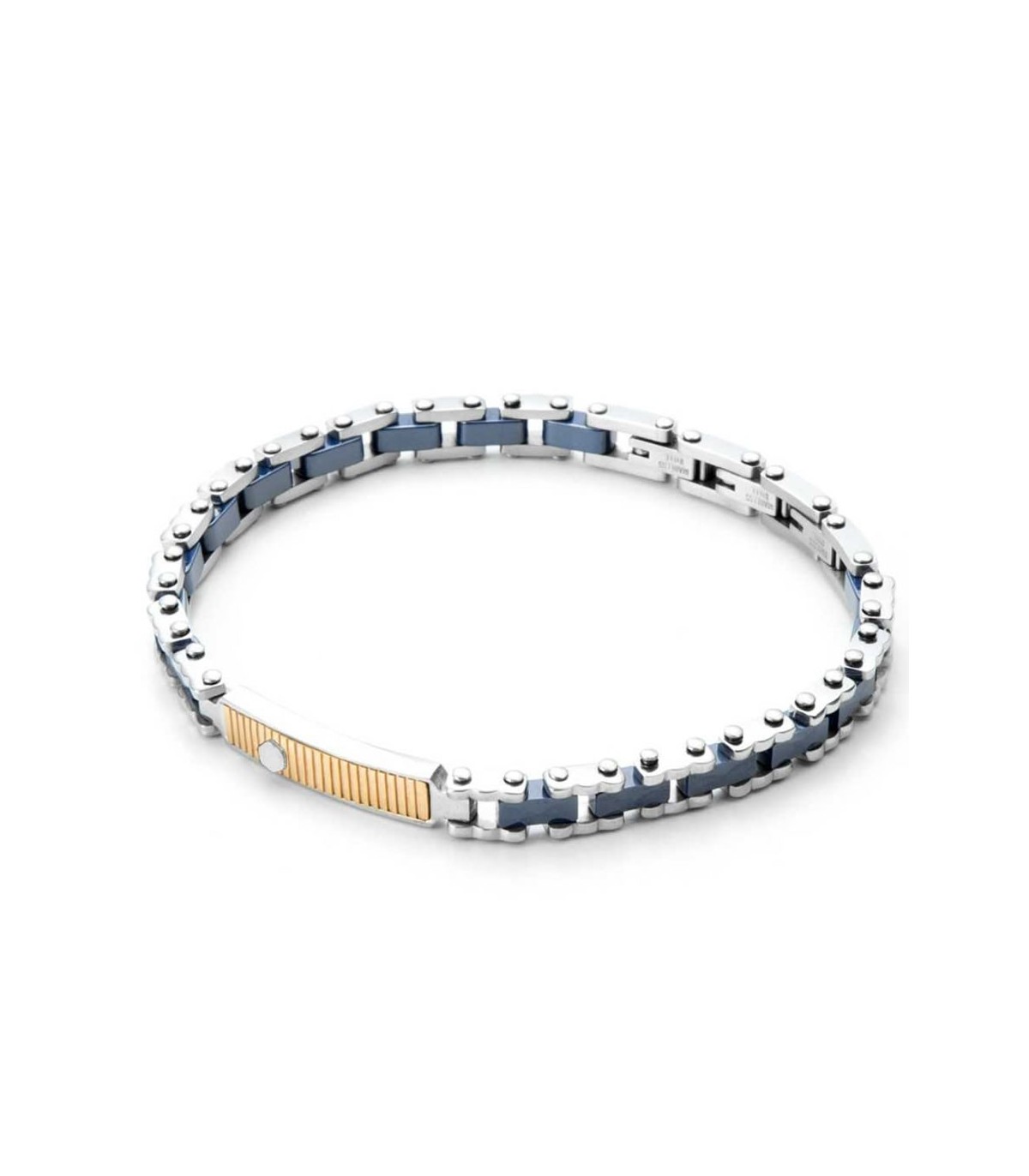 Braccialetto da uomo 4US di Cesare Paciotti realizzato in acciaio anallergico con finitura lucida. Intervalli in ceramica blu ed targa centrale placcata oro rosa con dettaglio silver. Ha lunghezza totale di 21 cm, regolabile grazie alla possibilità di rimuovere due maglie alla chiusura.