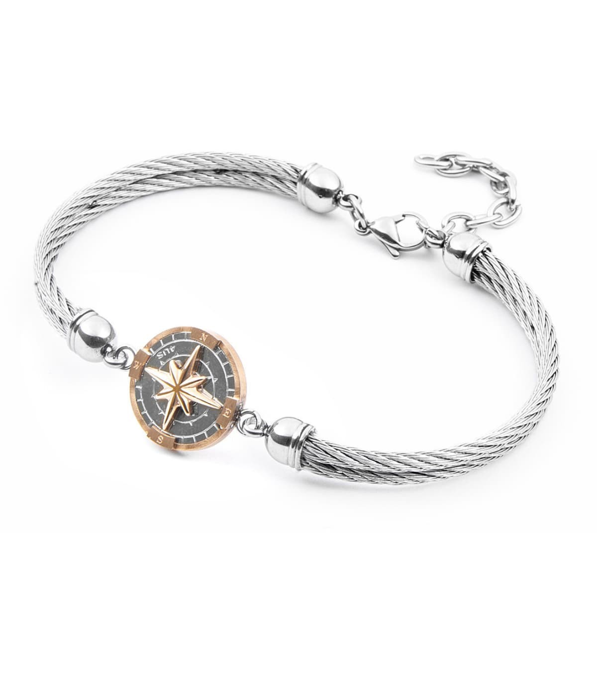 Bracciale da uomo 4US di Cesare Paciotti. Bracciale rigido con elemento centrale la rosa dei venti, realizzato in acciaio e finiture rosè. Lunghezza totale di 18cm più 4cm in riduzione. Chiusura a moschettone.