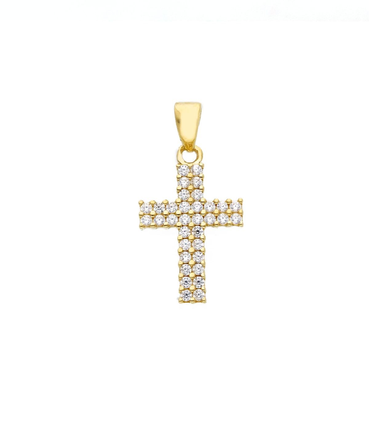 Ciondolo della collezione MiRaggi Everyday. Ciondolo croce in oro giallo e impreziosita da zirconi bianchi.