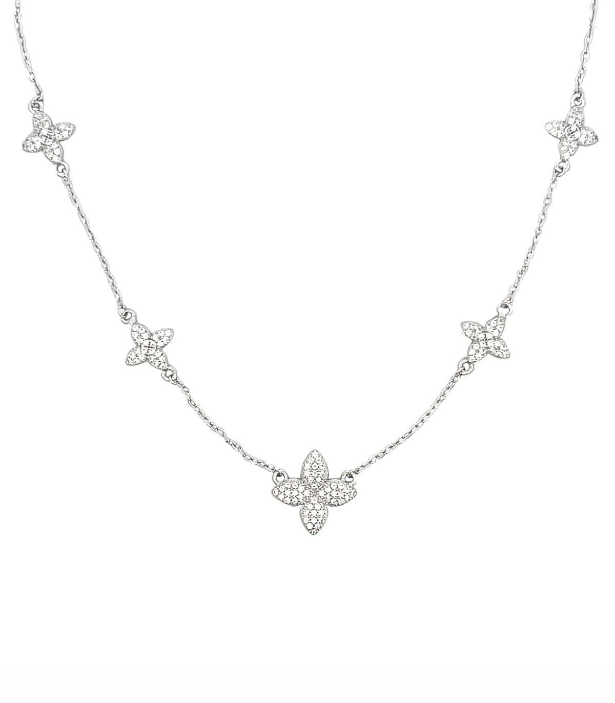 Collana realizzata in argento con fiori passanti a quattro petali, impreziositi da pavé di zirconi bianchi.