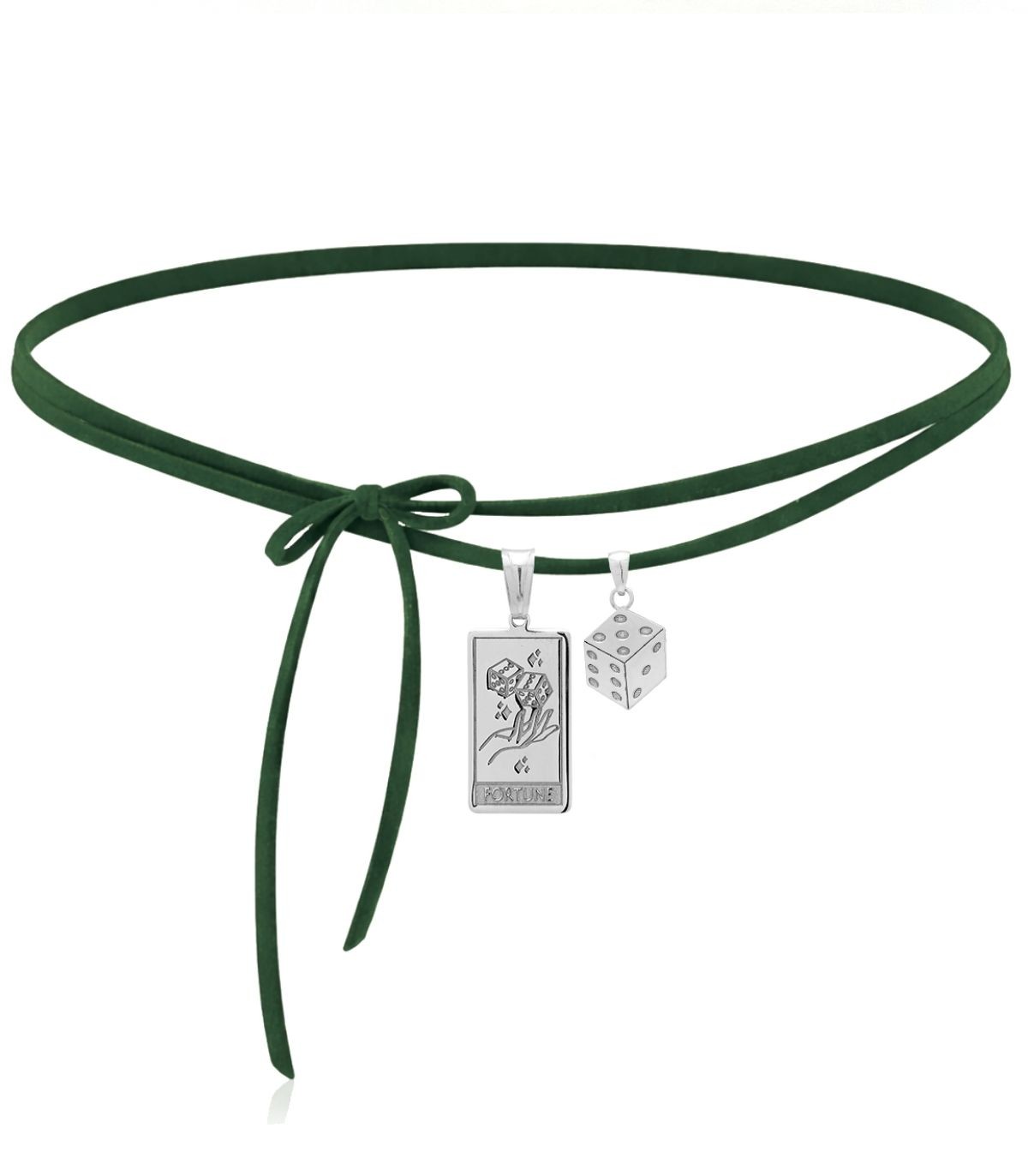 Collana Choker Fortune della Collezione MiRaggi Amulets, realizzato con cordino in tessuto Alcantara Verde Bosco. Completa il girocollo un ciondolo dado pendente in argento.