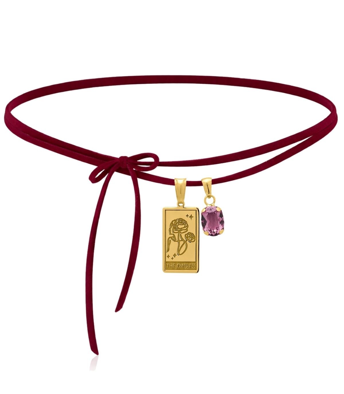 Collana Choker The Empress della Collezione MiRaggi Amulets, realizzato con cordino in tessuto Alcantara bordeaux. Completa il girocollo un ciondolo con pietra naturale Swarovski pendente su base argento.