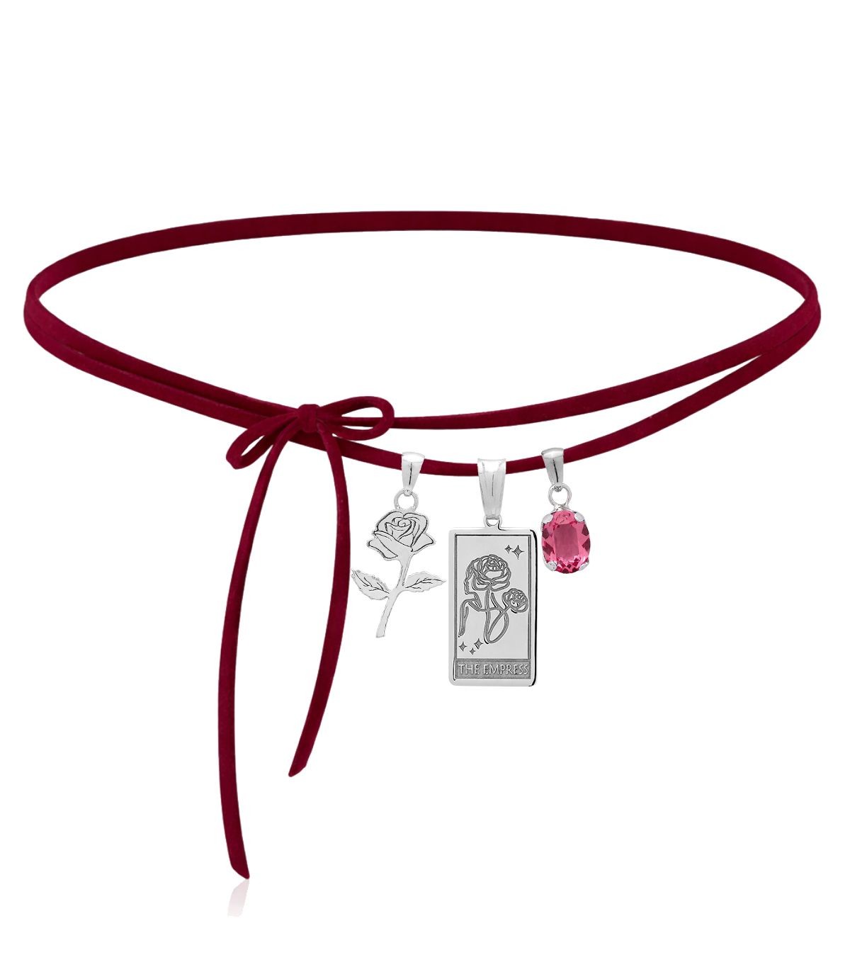 Collana Choker The Empress della Collezione MiRaggi Amulets, realizzato con cordino in tessuto Alcantara bordeaux. Completa il girocollo un ciondolo con pietra naturale Swarovski e un ciondolo Rosa pendente su base Argento 925.