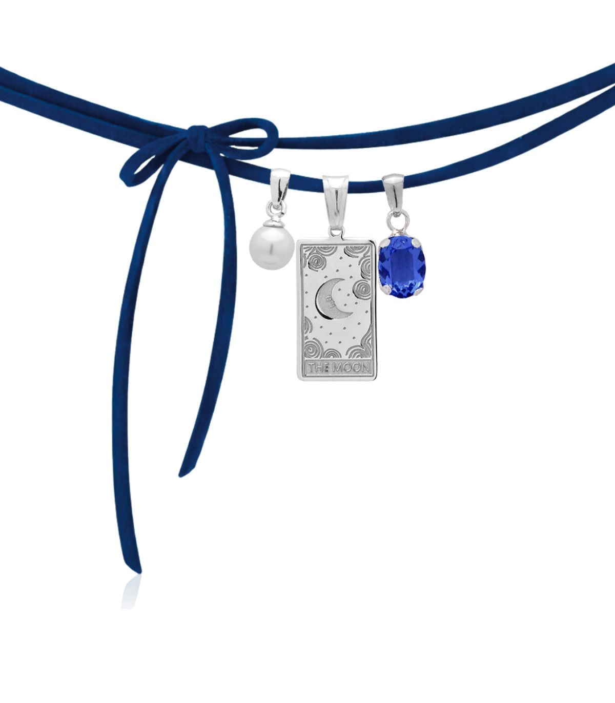 Collana Choker The Moon della Collezione MiRaggi Amulets, realizzato con cordino in tessuto Alcantara Blu. Completa il girocollo i ciondoli con perla Swarovski e con pietra naturale Swarovski su base argento.