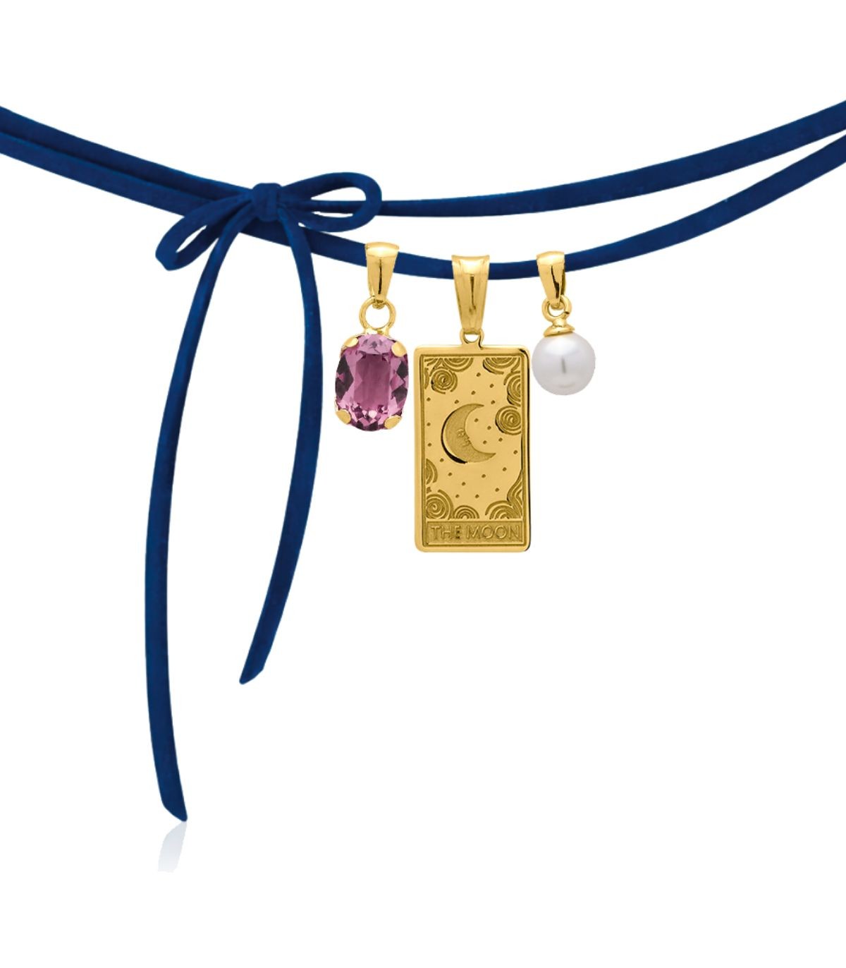Collana Choker The Moon della Collezione MiRaggi Amulets, realizzato con cordino in tessuto Alcantara Blu. Completa il girocollo un ciondolo con perla Swarovski e un ciondolo con pietra naturale Swarovski in Argento 925 placcato oro giallo.