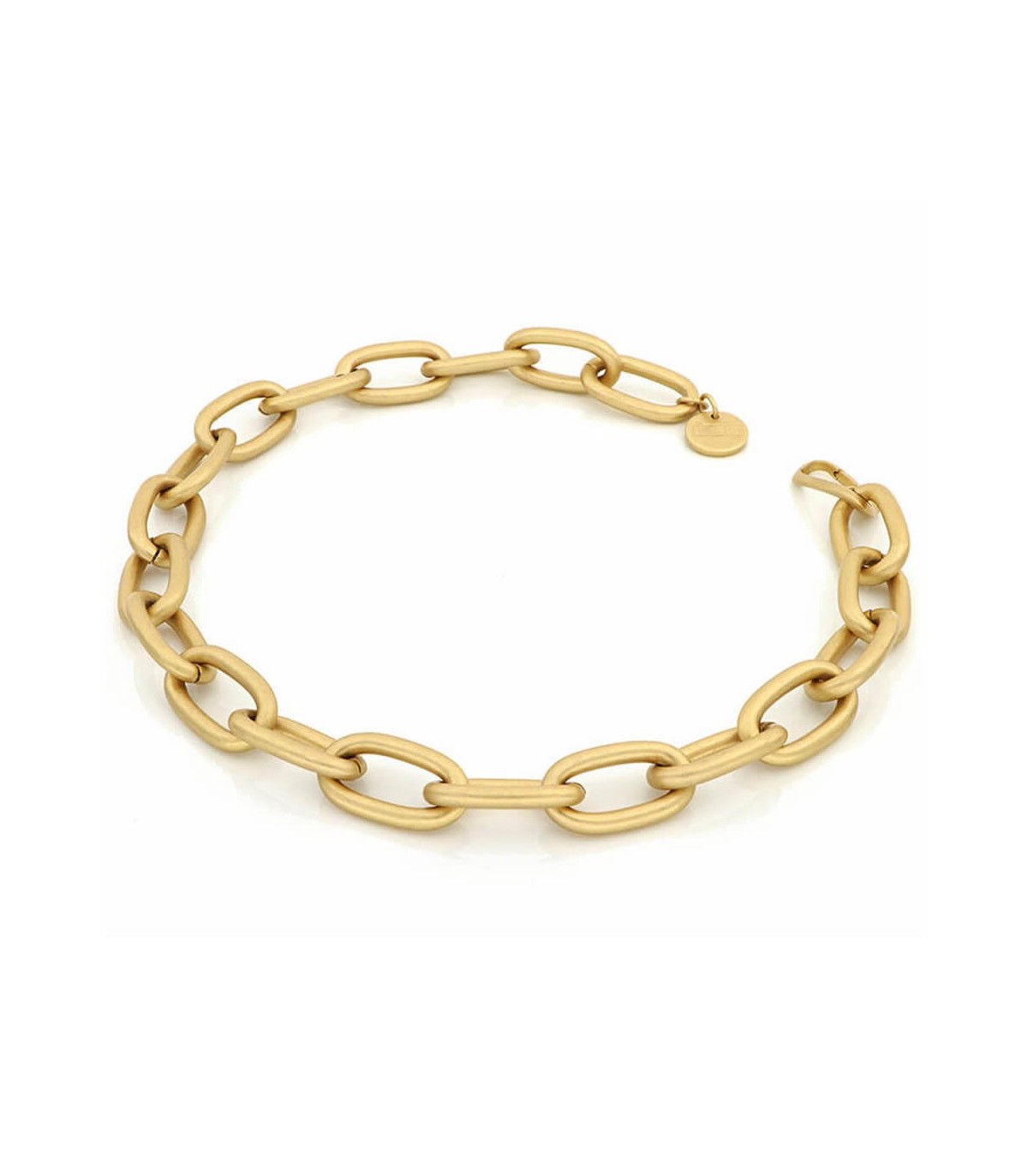 Girocollo in bronzo dorato con catena di ovali. Finitura sabbiata. Chiusura con moschettone.