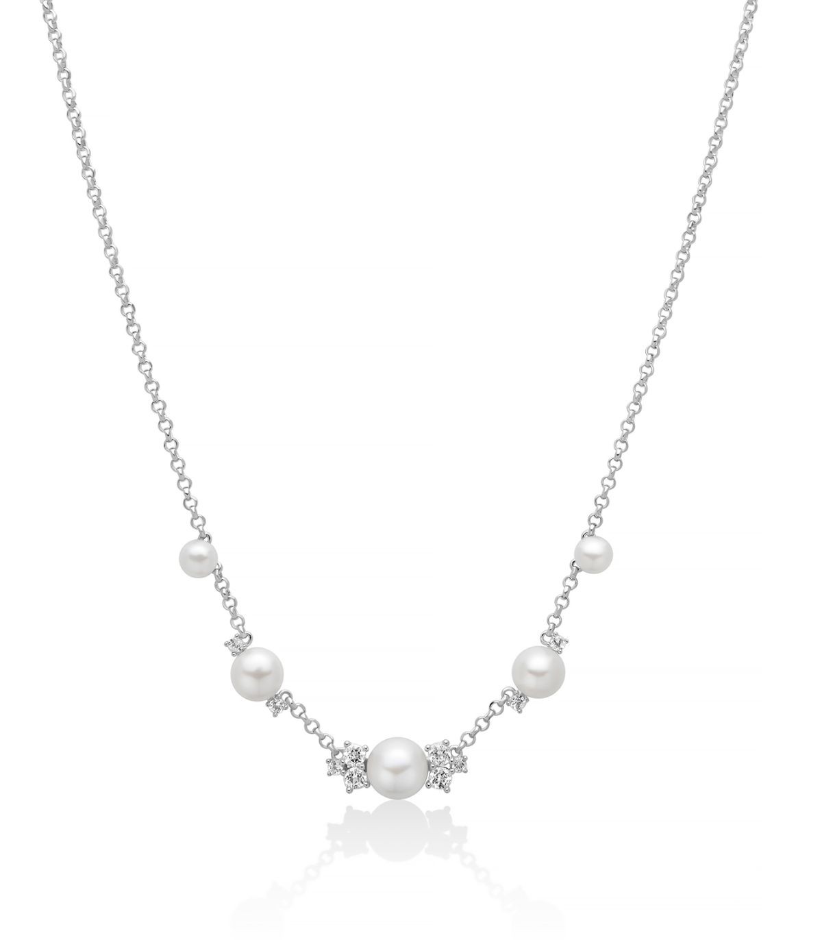 Collana Miluna, realizzata in argento e impreziosita da cinque perle vere bottone (due da 5-5,5 mm, due da 7-7,5 e una da 8-8,5 mm) e dieci zirconi bianchi (0,76 ct totali). Chiusura moschettone in argento.