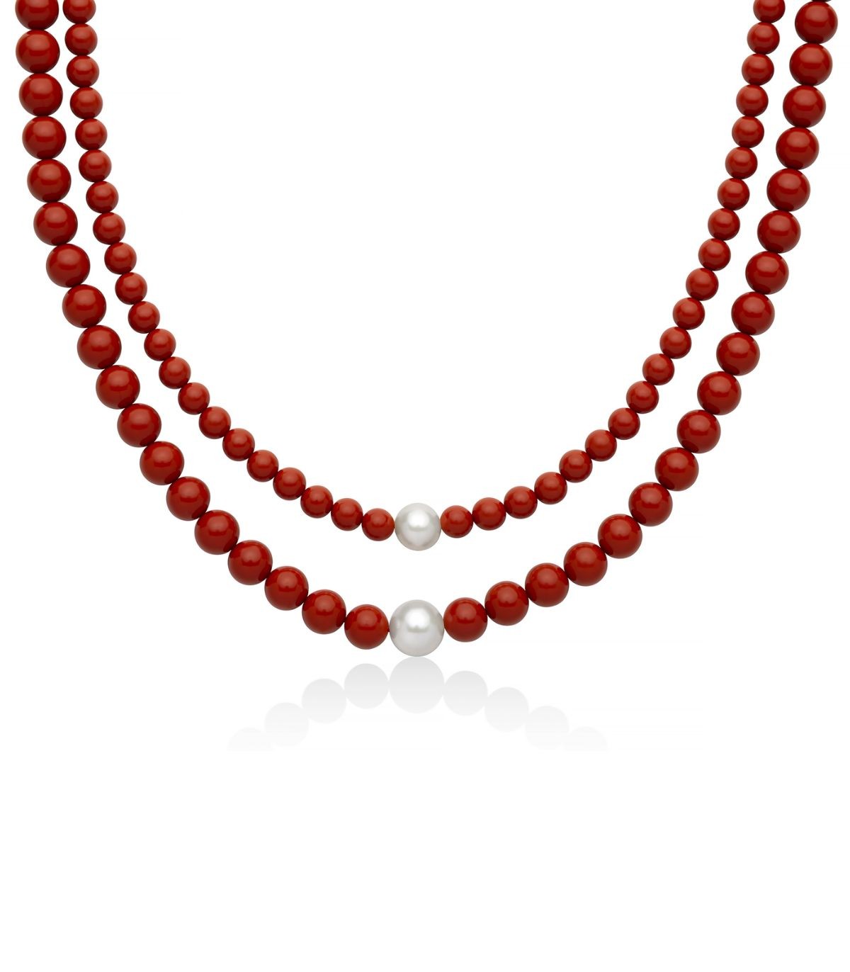 Collana Miluna della collezione Terra e Mare, realizzata da doppio filo di perle in pasta di corallo rosso (6-8 mm) e due perle bianche (8,5-9 e 9,5-10 mm). Con chiusura moschettone in argento.