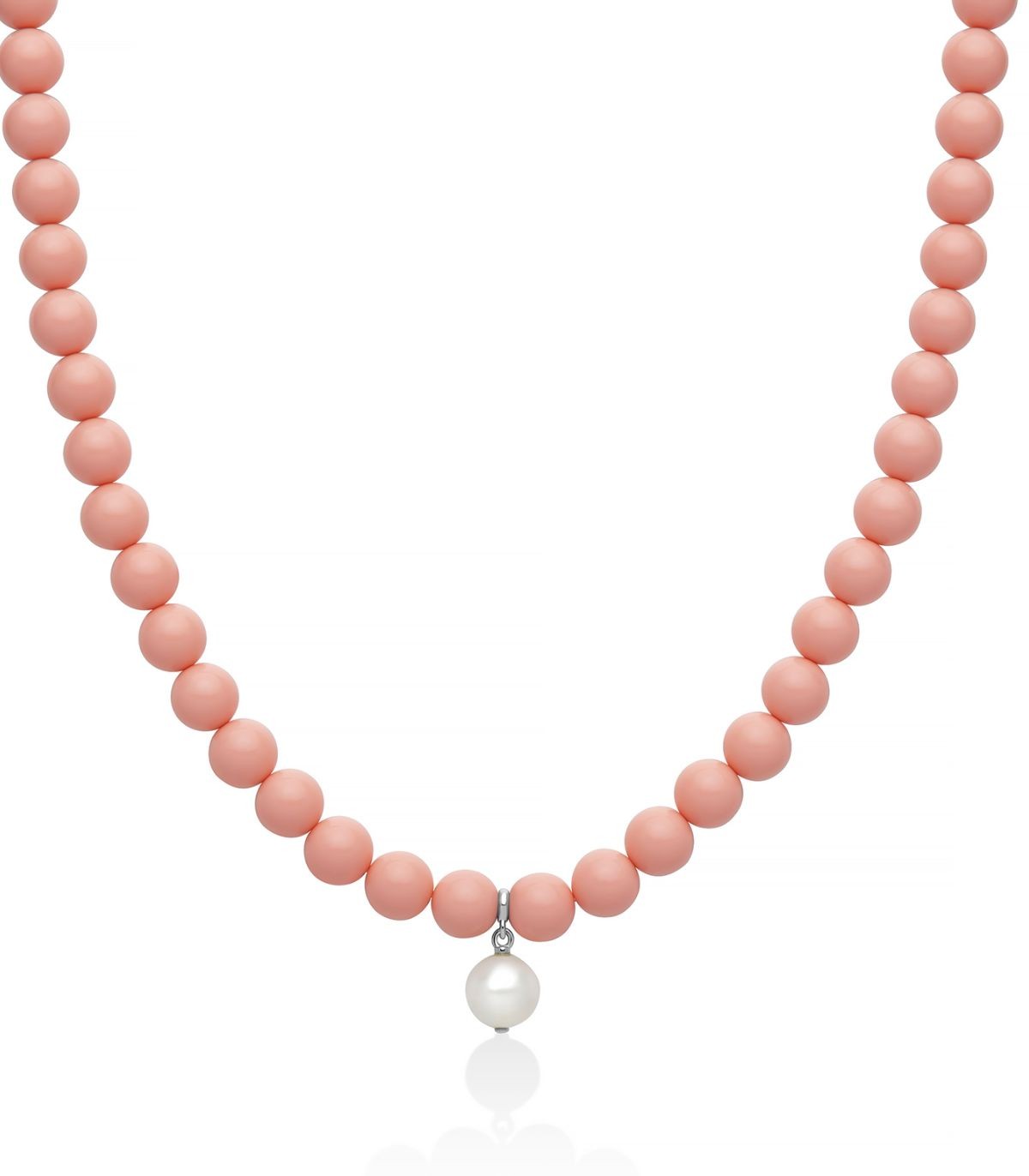 Collana Miluna della collezione Terra e Mare, realizzata da filo di perle in pasta di corallo rosa da 8 mm e perla bianca vera pendente 8,5-9 mm. Con chiusura moschettone in argento.
