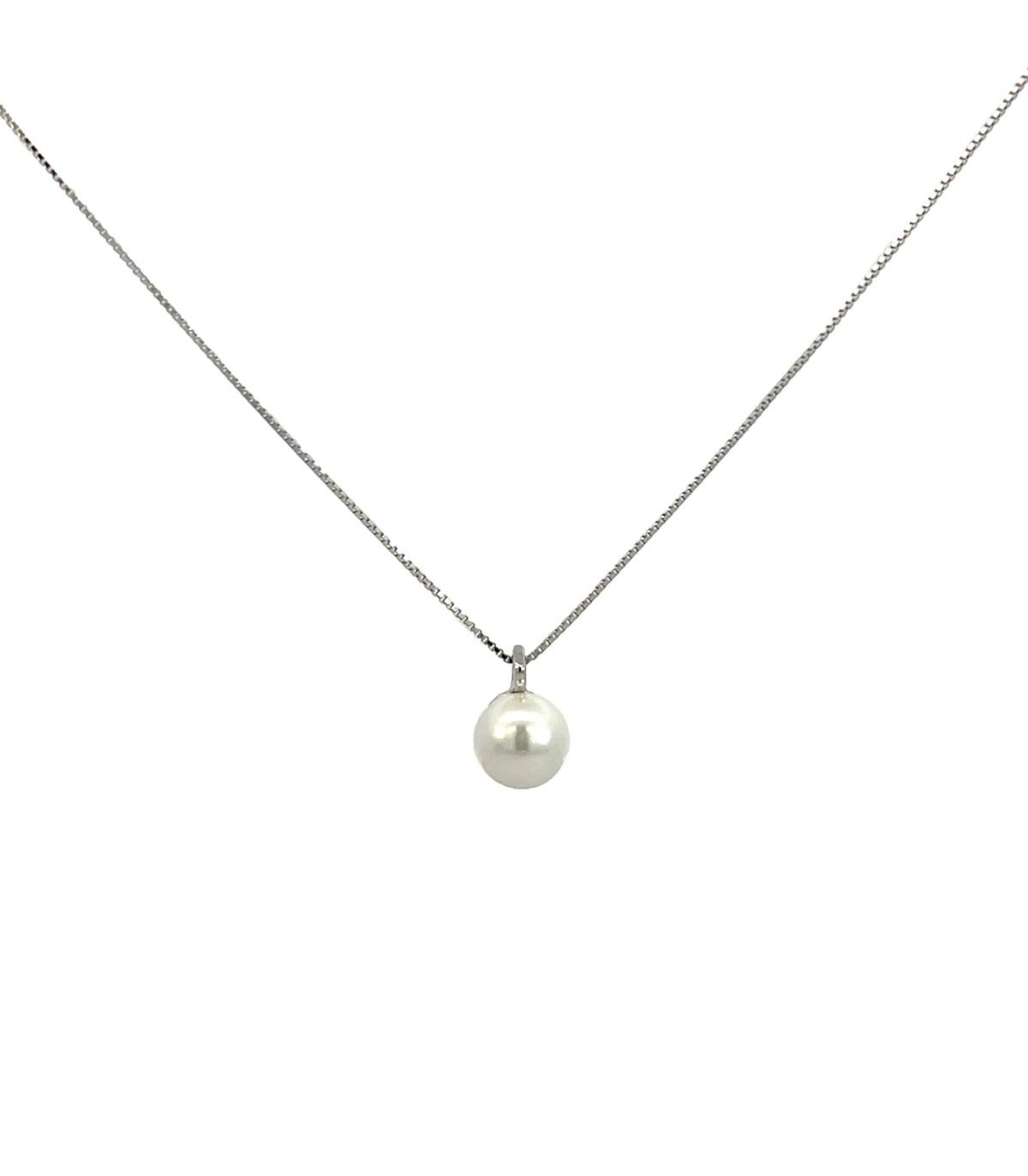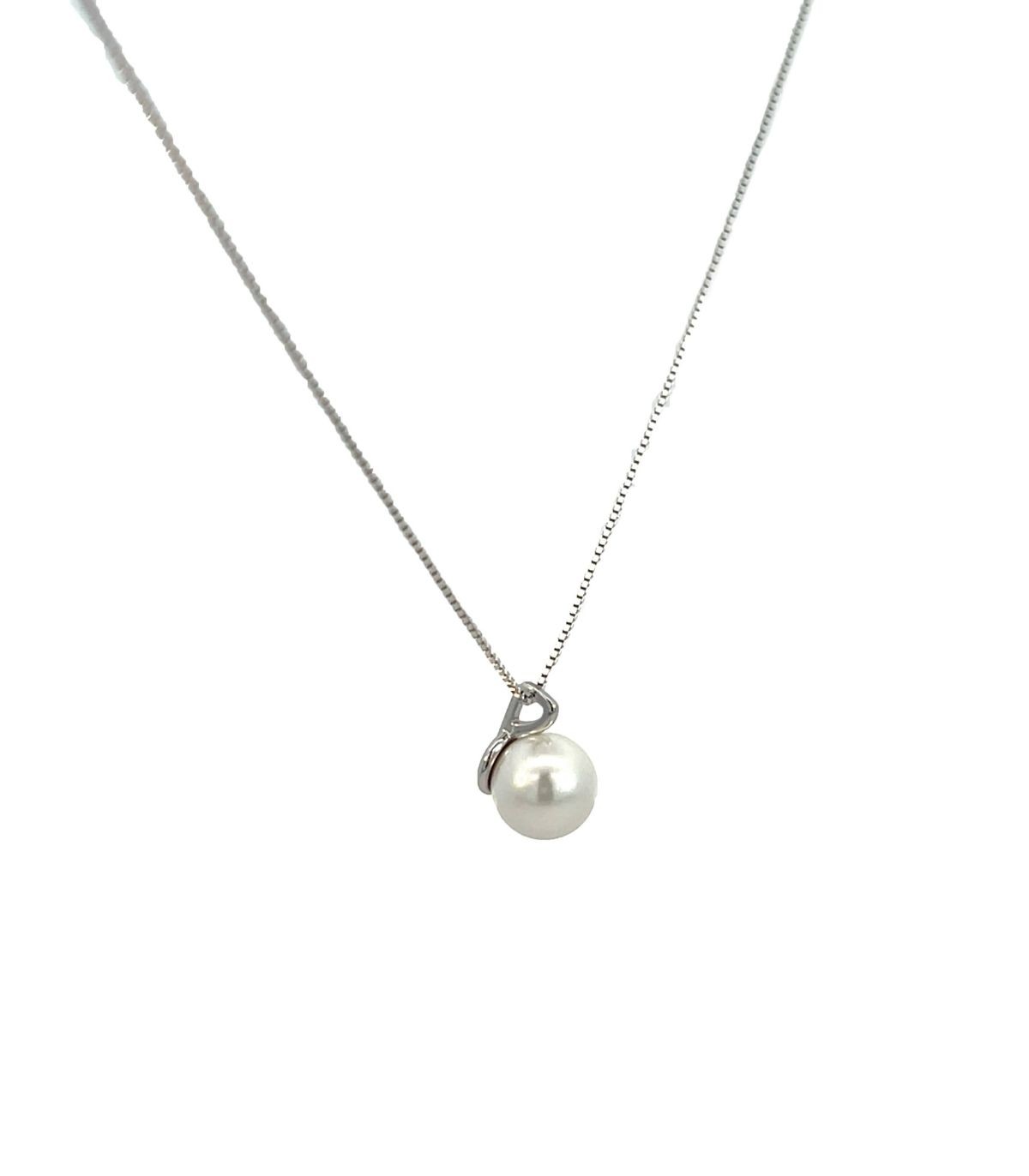Collana realizzata in argento e impreziosita da perla bianca pendente.