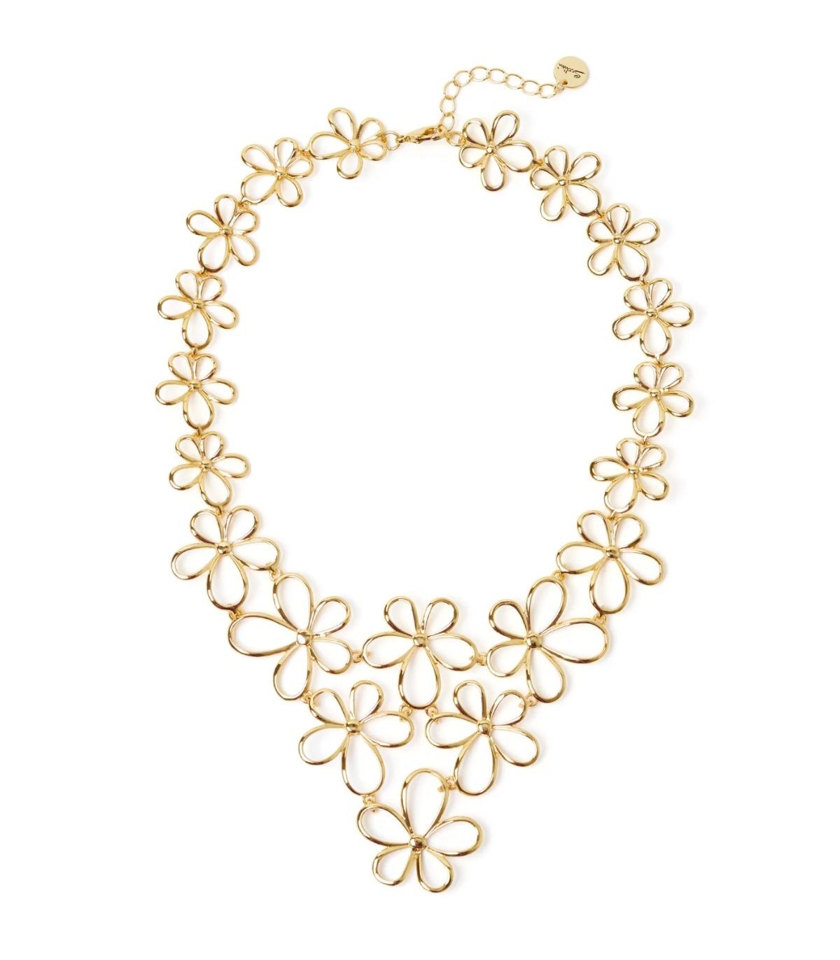 Collana caratterizzata da un design a bavaglio con catena e sezione frontale composti da fiorellini filiformi. Chiusura a moschettone.