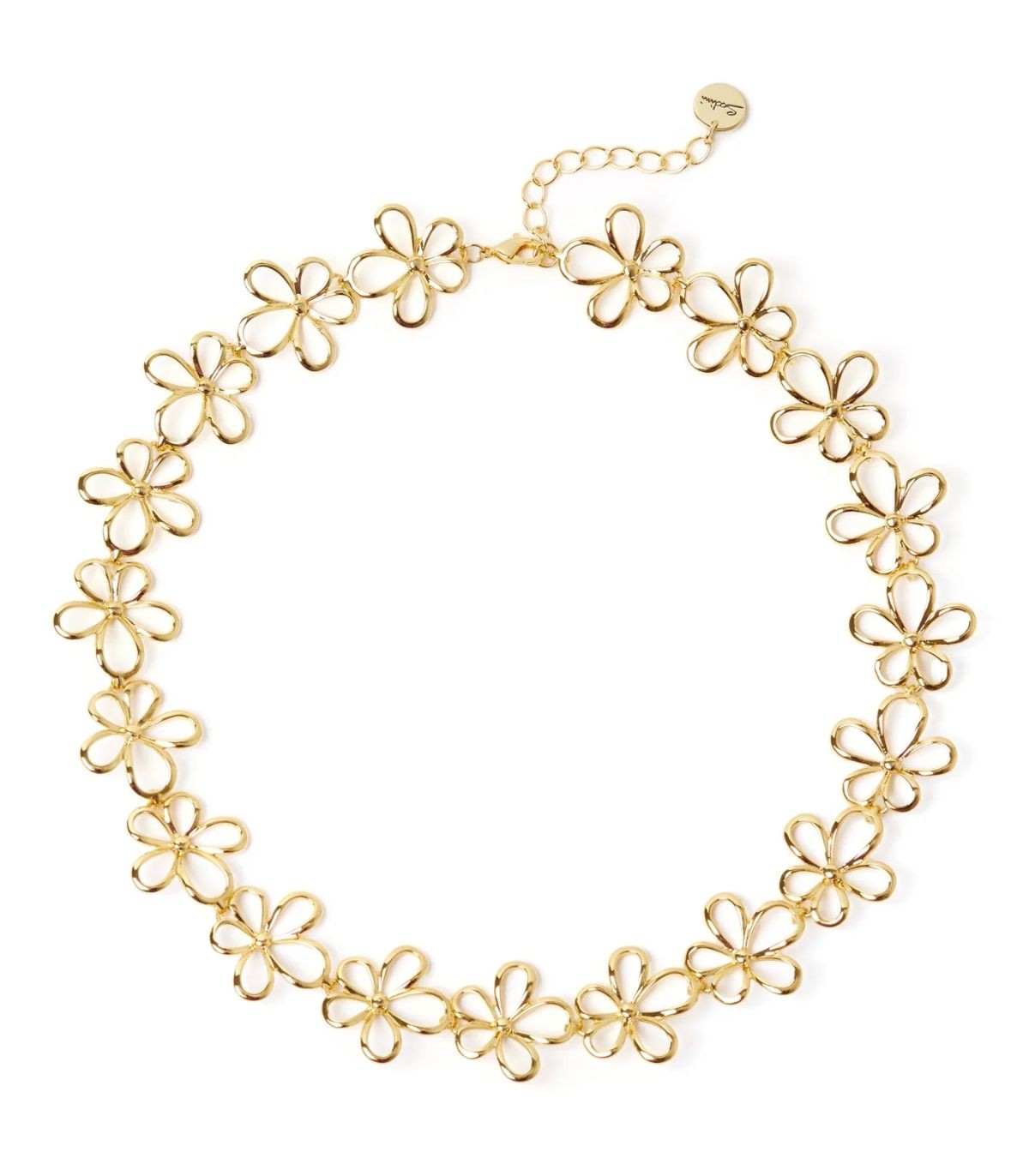 Collana caratterizzata da un design con catena composta da fiorellini filiformi. Chiusura a moschettone e logo Sodini sull'estensione.
