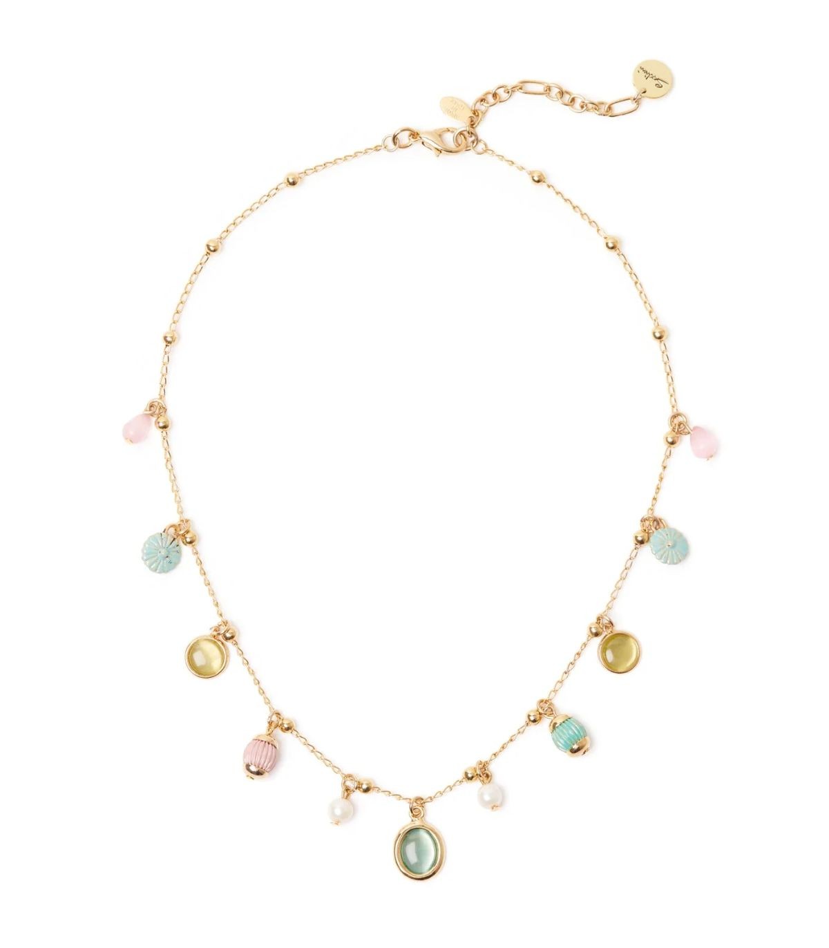 Collana con sottile catena che ospita delle mini sfere e dalla quale cadono piccoli pendenti. Accessorio perfetto per ogni occasione nelle sue cromie multicolore e oro. Targhetta Sodini sull'estensione e chiusura a moschettone.