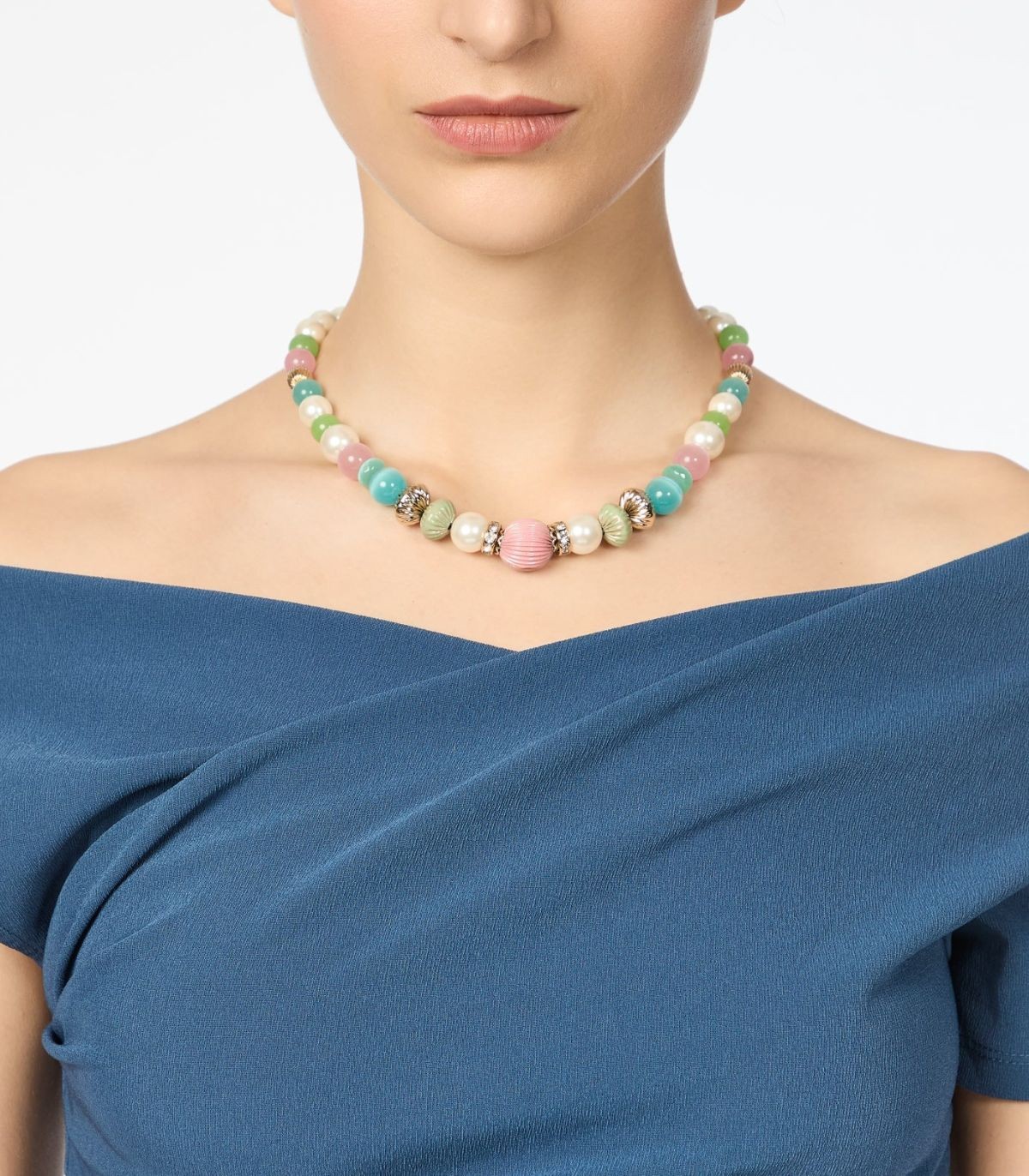 Collana con luminoso filo composto da perle, boule ed elementi rigati che arricchiscono di splendore il look. Chiusura a moschettone.