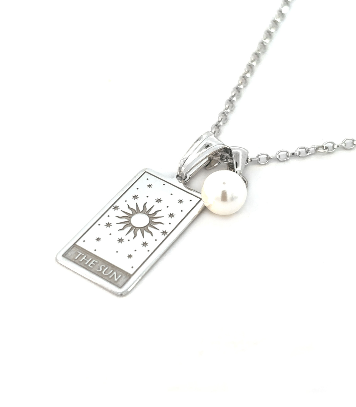 Collana Tarocchi The Sun della Collezione MiRaggi Amulets, realizzato in argento 925. Completa il girocollo un ciondolo con perla Swarovski pendente su base argento.