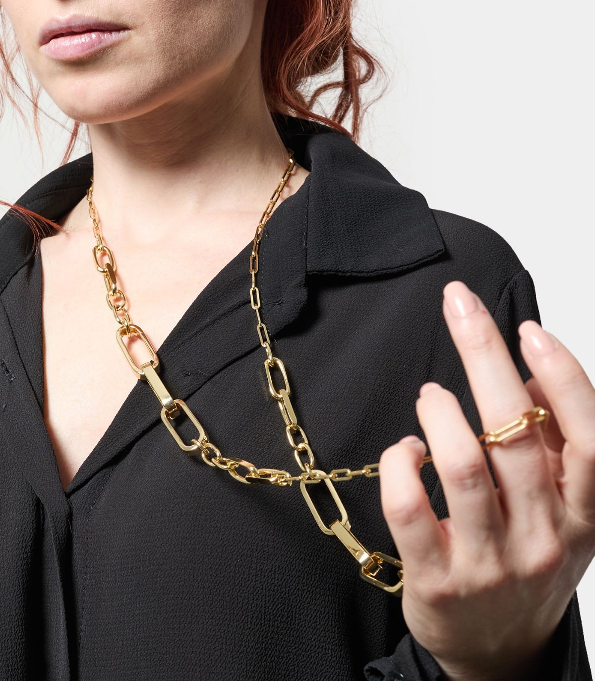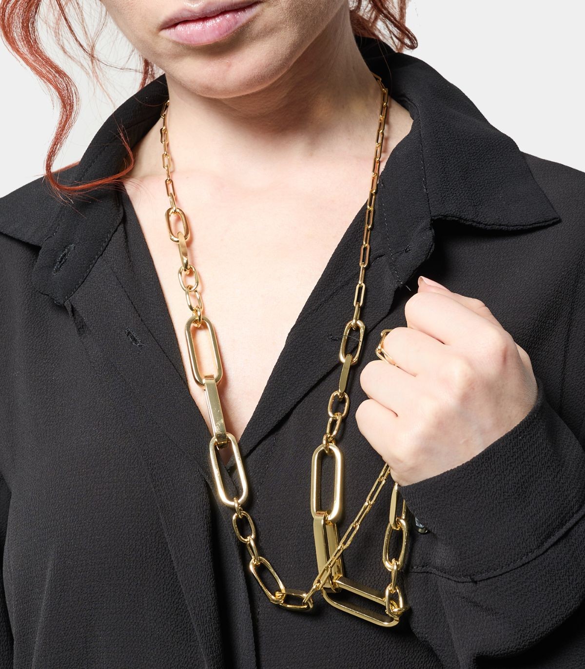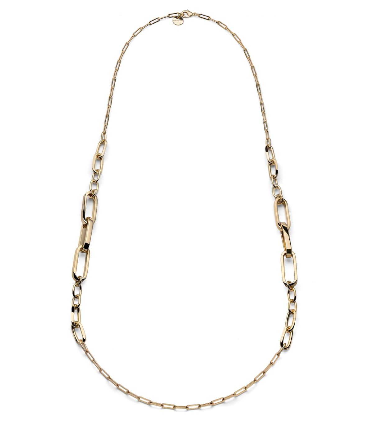 Collana catena forzatina grandezze alterne con bagno in oro. Misura 106 cm e chiusura a moschettone.