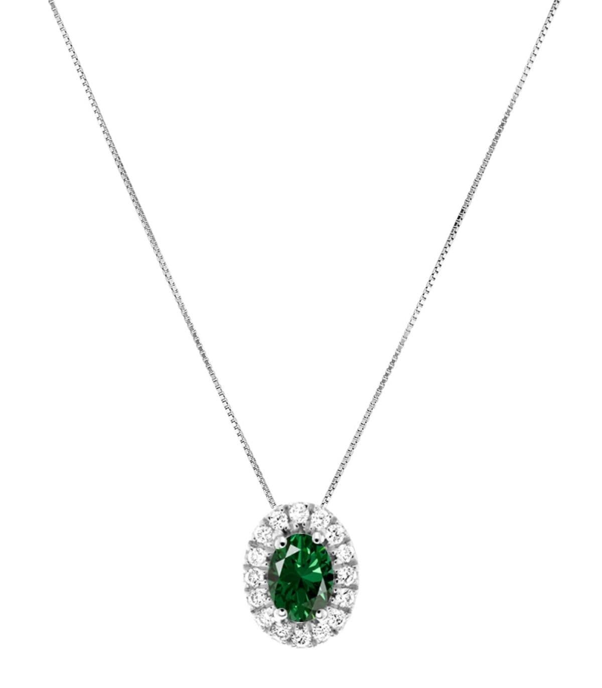 Girocollo da donna collezione Raggi. Realizzato in oro bianco 9kt con smeraldo 0,25ct e diamanti 0,05 ct colore G purezza SI.