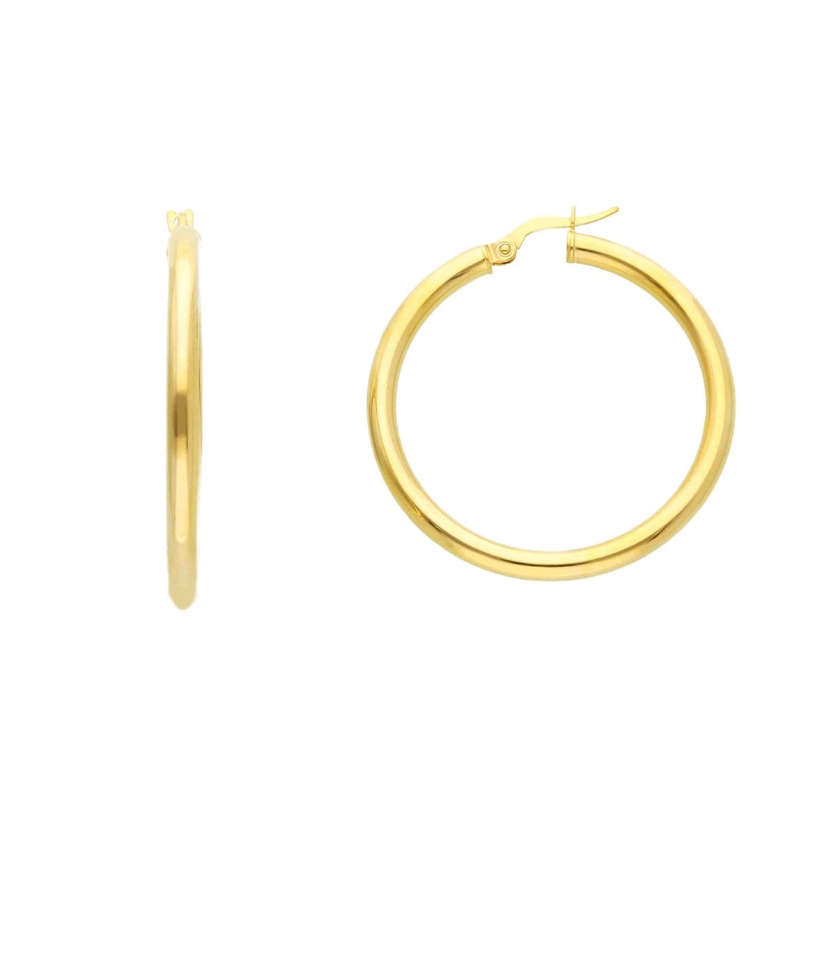 Orecchini cerchio della Collezione Miraggi Essentials. Orecchini a cerchio classici lisci, realizzati in oro giallo 9kt. Chiusura a scattino.