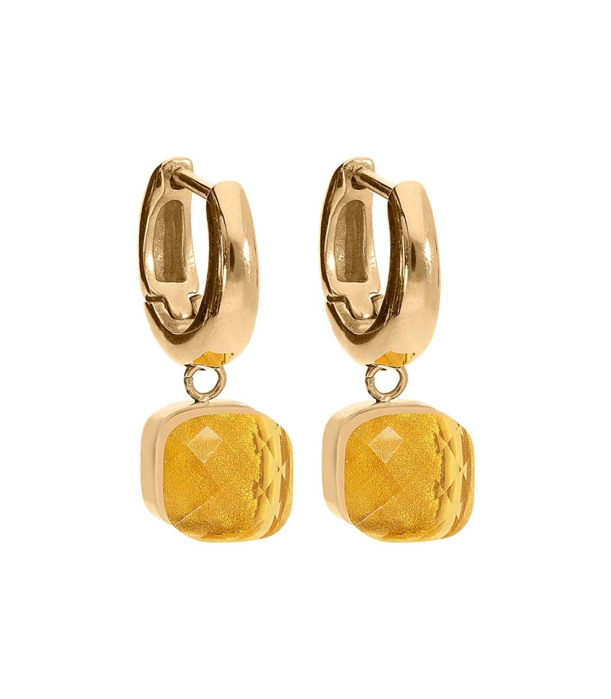 Orecchini a cerchio realizzati in acciaio dorato, caratterizzati da un pendente con cristallo solitario color arancione sfaccettato.