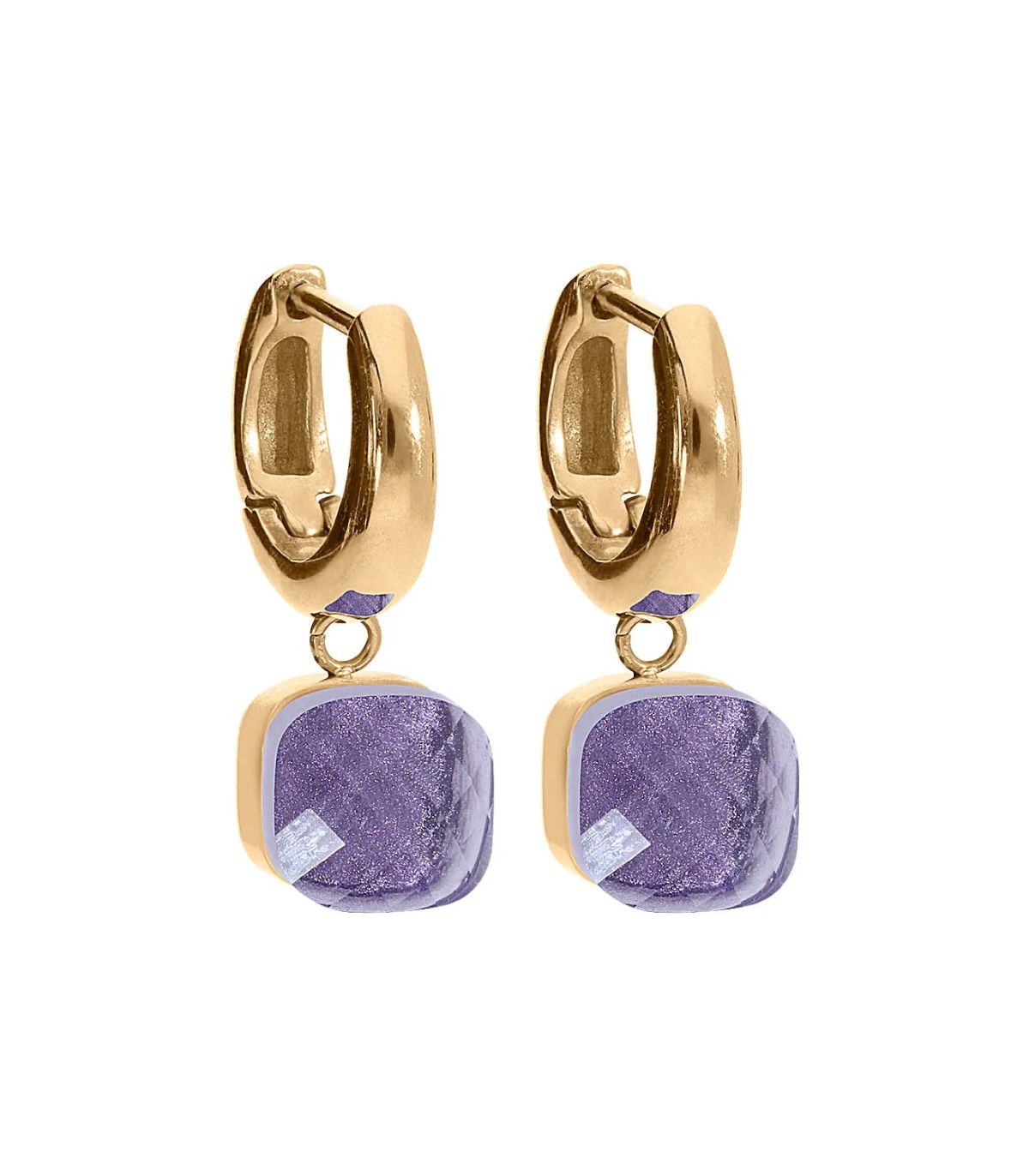 Orecchini a cerchio realizzati in acciaio dorato, caratterizzati da pendente con cristallo solitario color viola sfaccettato.