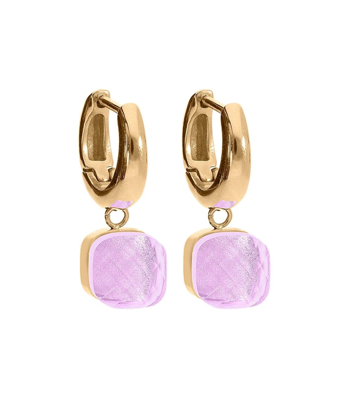 Orecchini a cerchio realizzati in acciaio dorato, caratterizzati da pendente con cristallo solitario color lavanda sfaccettato.