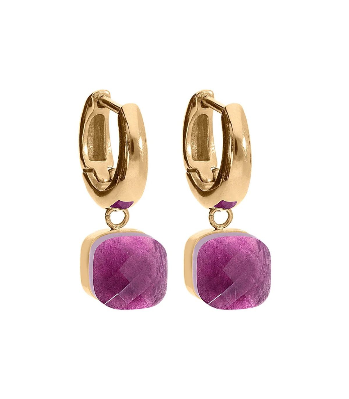 Orecchini a cerchio realizzati in acciaio dorato, caratterizzati da pendente con cristallo solitario color viola magenta sfaccettato.
