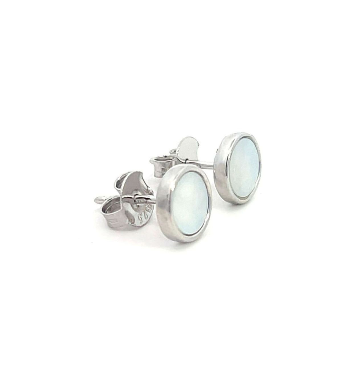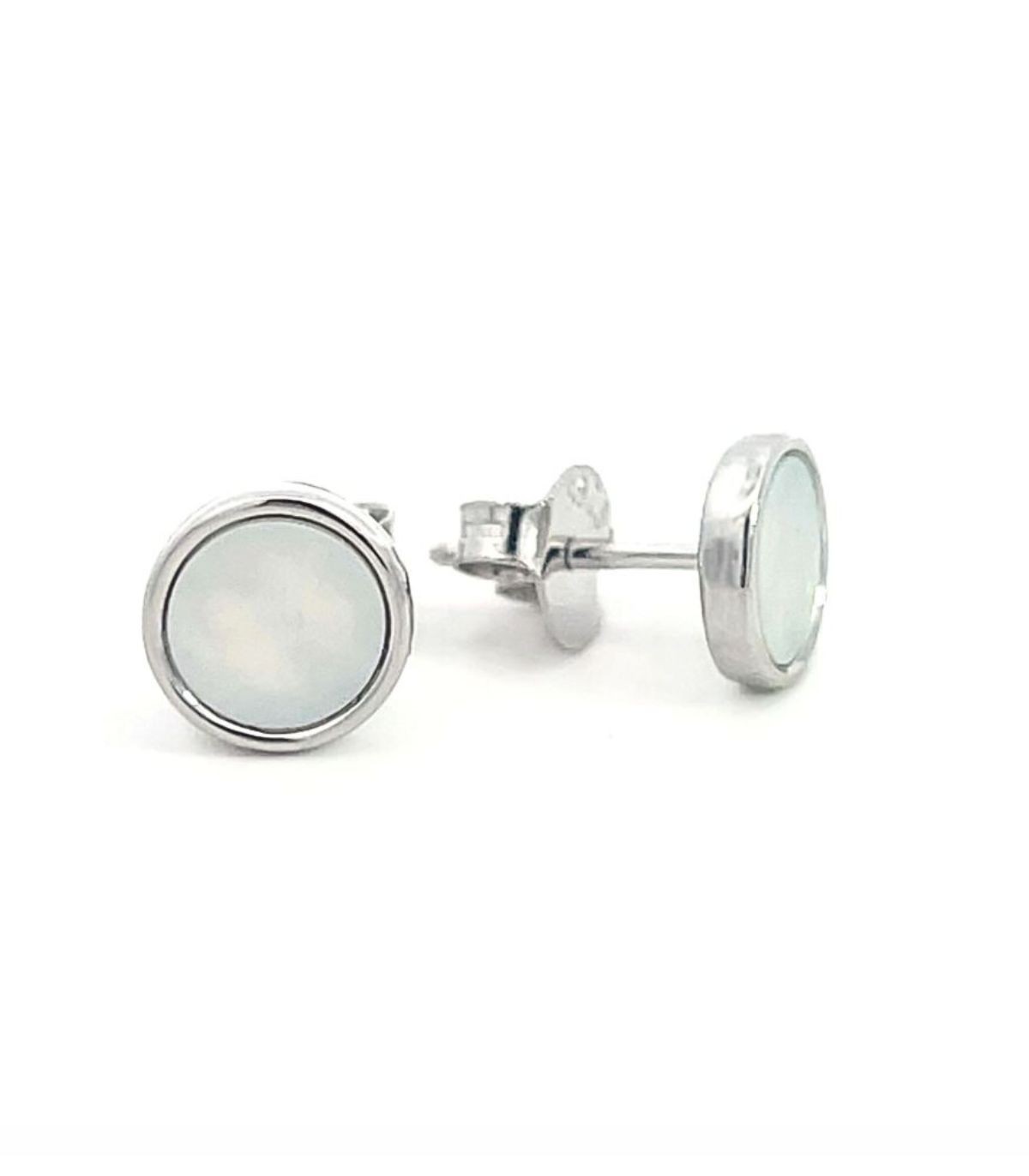 Orecchini lobo tondi con Madreperla, realizzati in argento 925. Chiusura a farfalla.