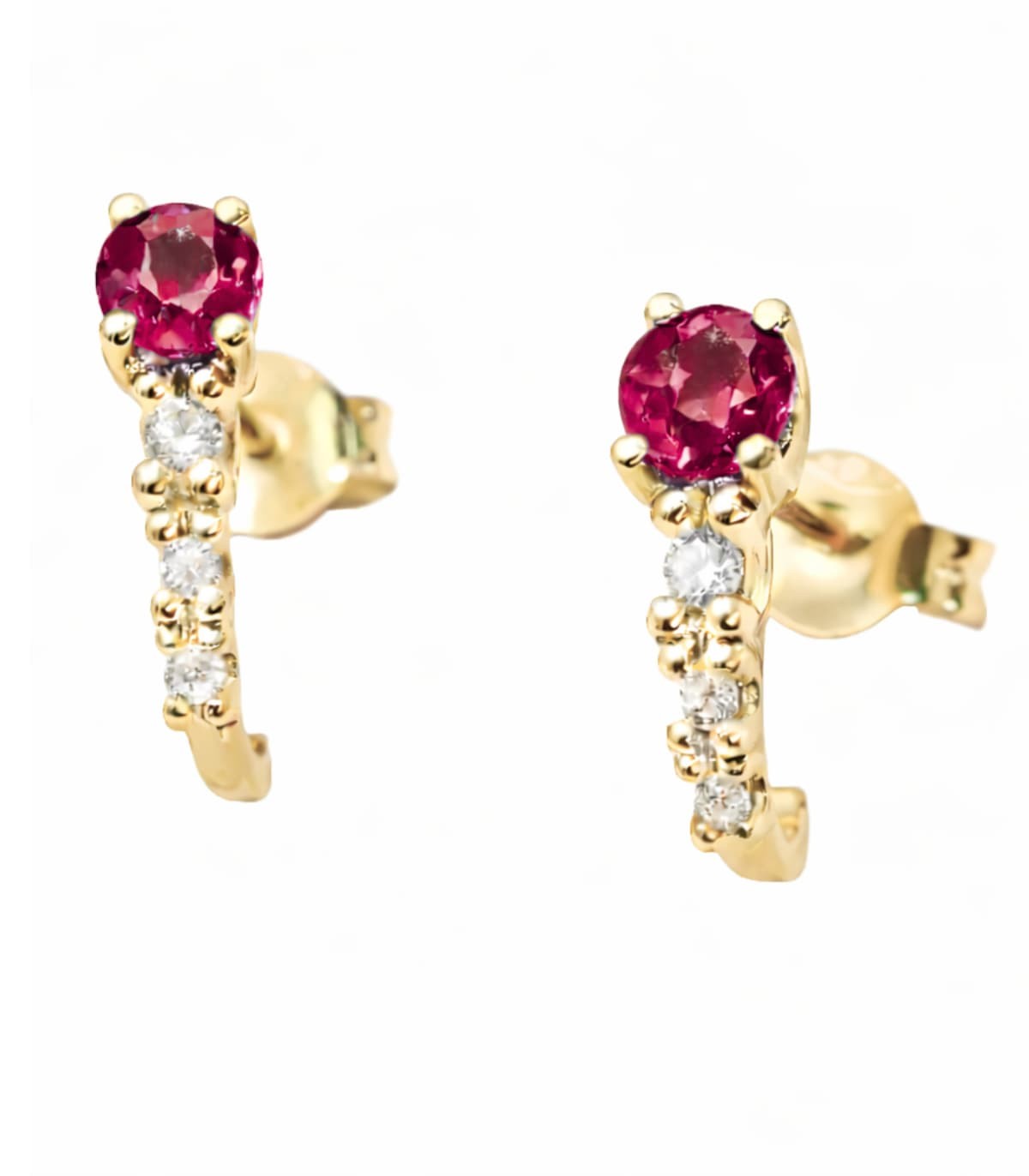 Orecchini collezione Miraggi Eternity. Orecchini a semicerchio aperto realizzati in oro giallo 9kt con rubini 0,60ct e 3 brillanti 0,07ct.