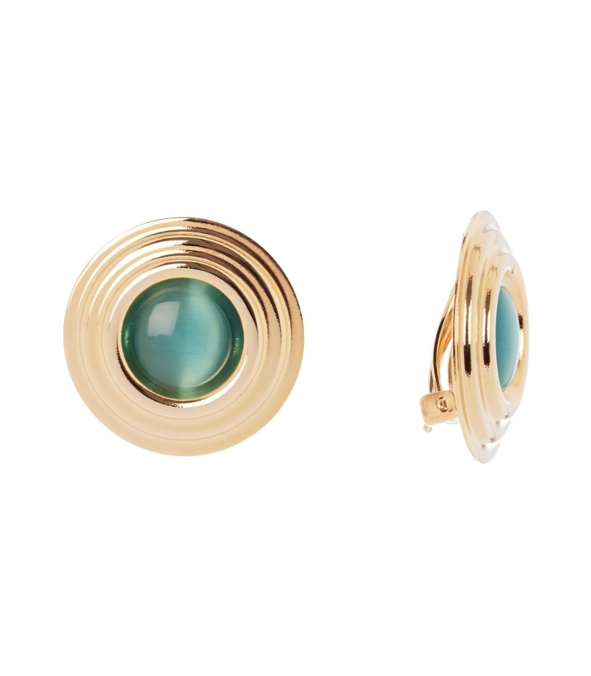 Orecchini con disco a cerchi in rilievo illuminato da un cabochon di colore blu. Chiusura a clip.