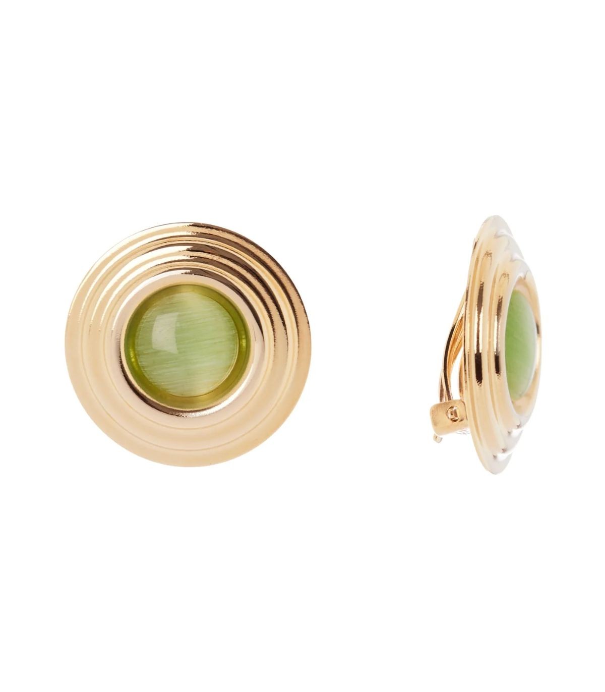 Orecchini con disco a cerchi in rilievo illuminato da un cabochon di colore verde. Chiusura a clip.