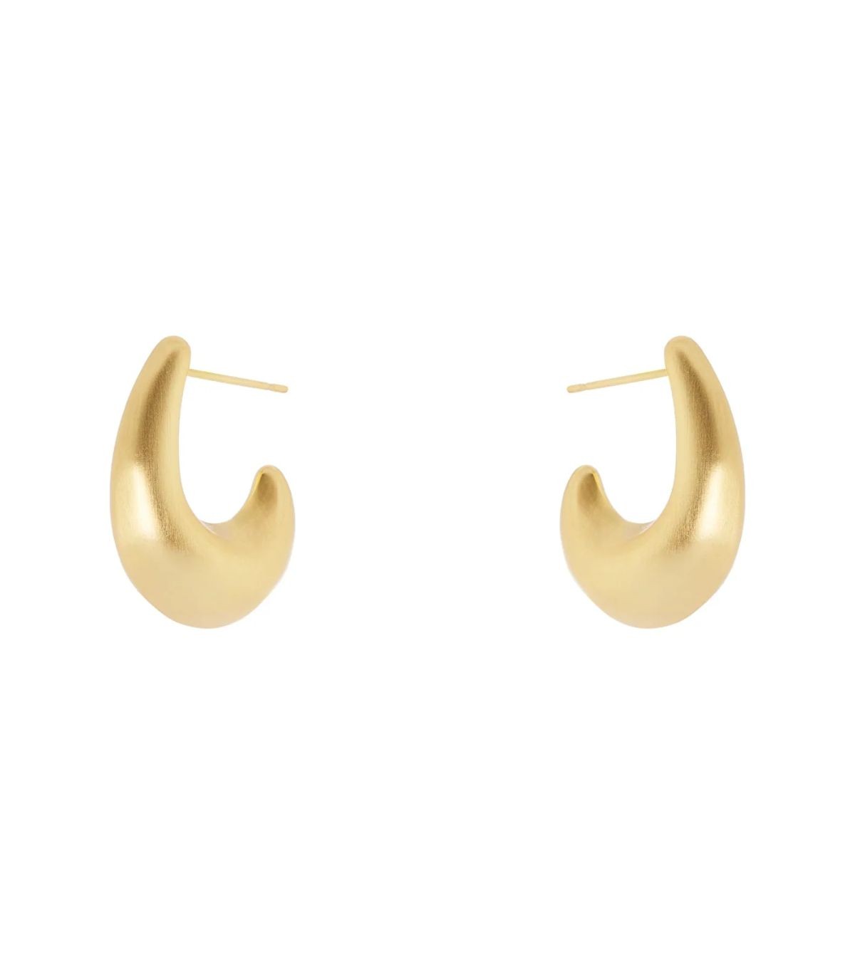 Orecchini pendenti a forma di semicerchio affusolato in una versione dalle cromie dorate e finitura matte. Chiusura a farfalla e logo Sodini sul retro.