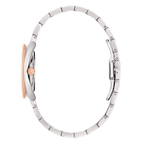 Si tratta di un orologio che unisce sport ed eleganza con cassa in acciaio 316L bicolor acciaio/oro e quadrante madreperla con datario e tre brillanti bianchi. Cinturino in acciaio bicolor con chiusura deployante.