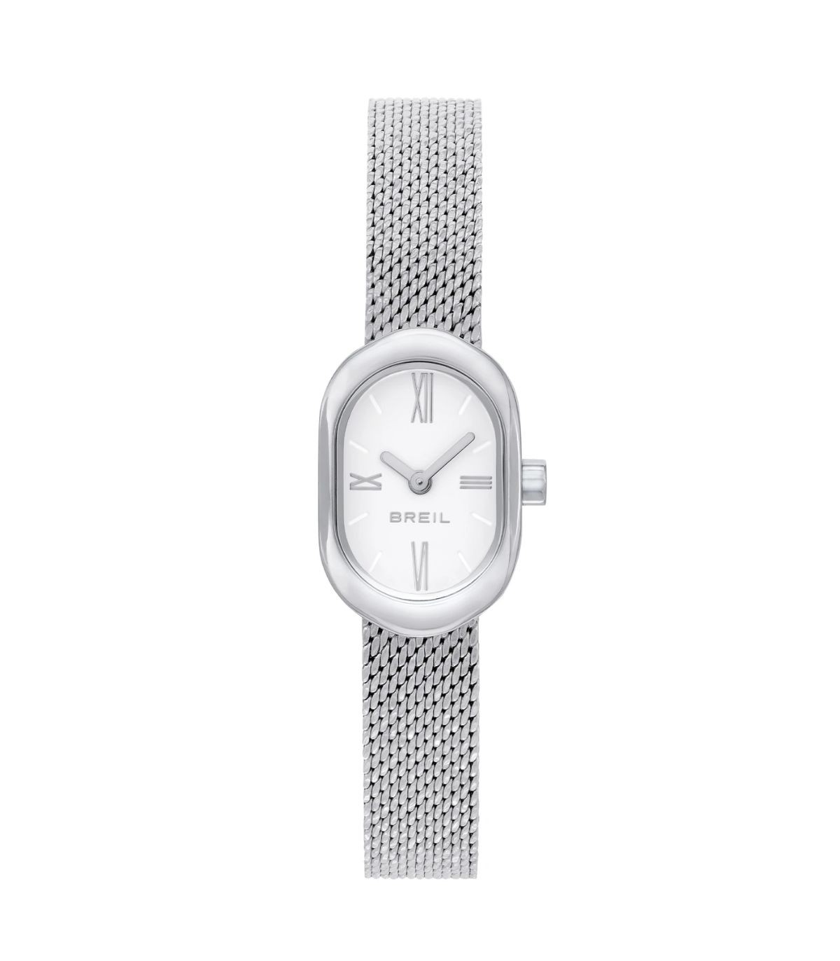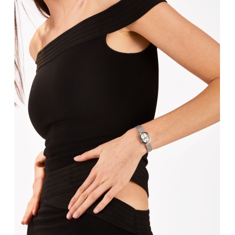 Orologio Solo Tempo da donna, caratterizzato da un quadrante bianco, impreziosito da indici applicati con numeri romani, e una cassa in acciaio con finish lucido dalla forma ovale. Il bracciale in maglia mesh, in acciaio, è caratterizzato da un sofisticato effetto diamantato, che aggiunge un tocco di luce e modernità.