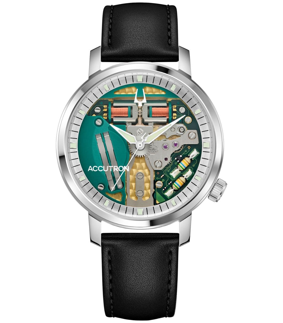 Orologio Bulova Accutron Spaceview 314 26A211 unisce avanguardia tecnica e uno stile subito riconoscibile. Al suo interno batte l’elettronico Diapason al quarzo Accutron Calibro 314, evoluzione contemporanea del leggendario sistema a diapason, che assicura precisione e costanza di marcia. Il quadrante aperto mette in mostra l’architettura del movimento, mentre il fondello in vetro zaffiro rivela finiture d’alta scuola come perlage e Côtes de Genève.