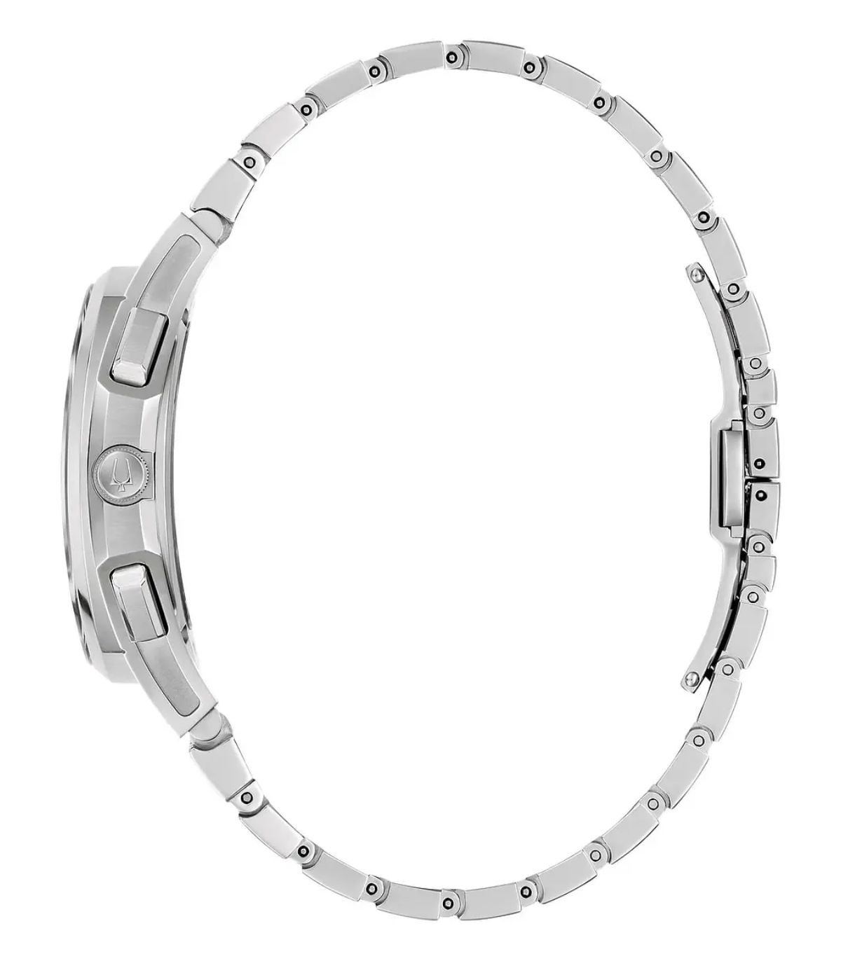 Orologio Cronografo Bulova della collezione Curv, caratterizzato da un movimento al quarzo dalla gioielleria curva, progettato per seguire ergonomicamente il profilo del polso.