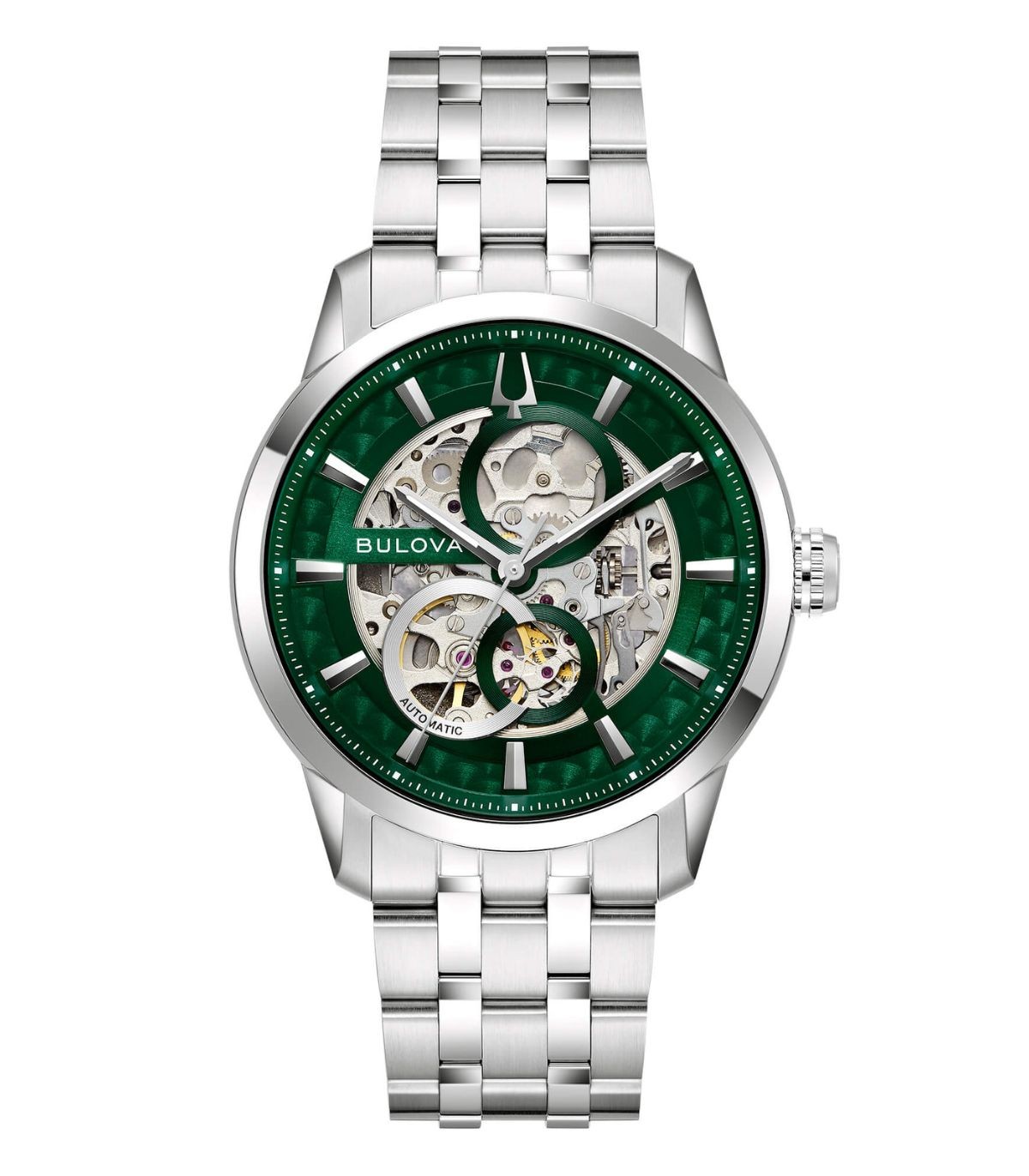 Orologio Bulova collezione Sutton. Orologio con movimento meccanico e funzione solo tempo. Cassa realizzata in acciaio dal diametro di 40 mm. Quadrante verde e cinturino in acciaio. Vetro Minerale e chiusura deployante con pulsanti. Fondello a vite con movimento a vista. Impermeabile fino a 30 m.