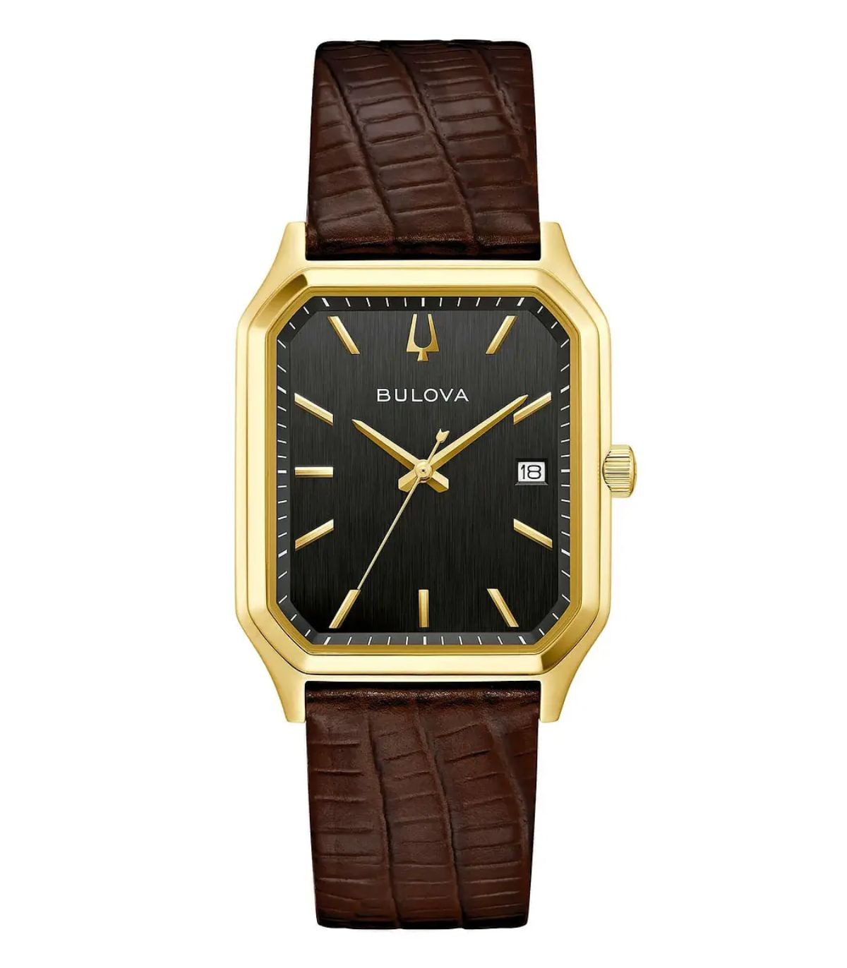 La cassa rettangolare in acciaio da 32x35,5 mm, incornicia un quadrante nero con finitura spazzolata verticale impreziosito dal simbolico Diapason a ore 12. Cinturino in vera pelle di di lucertola Tejus marrone con stampa a rilievo. Movimento al quarzo e impermeabile fino a 3 atm. Vetro Zaffiro.