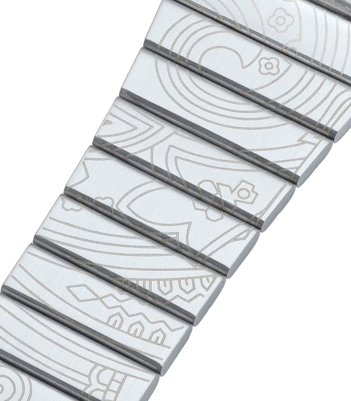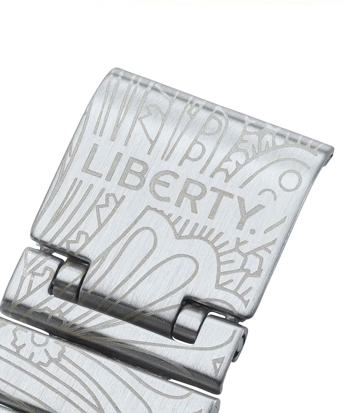 Quadrante squadrato e doppio display analogico-digitale, caratterizzato da linee geometriche che creano un elegante contrasto con le linee armoniose del motivo paisley inciso con laser su cinturino e quadrant. Completano il design il logo Liberty sulla fibbia e sul fondello. Realizzato in acciaio inossidabile, presenta una chiusura che può essere regolata con grande facilità in base alle proprie esigenze.